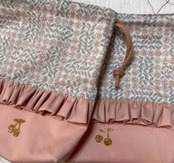 リバティ タナローン スリーピングローズ(メルシー)と海のブロード ストロベリークリーム(c&s)で片面フリル付きデザインでお弁当袋とコップ袋を作製しました。