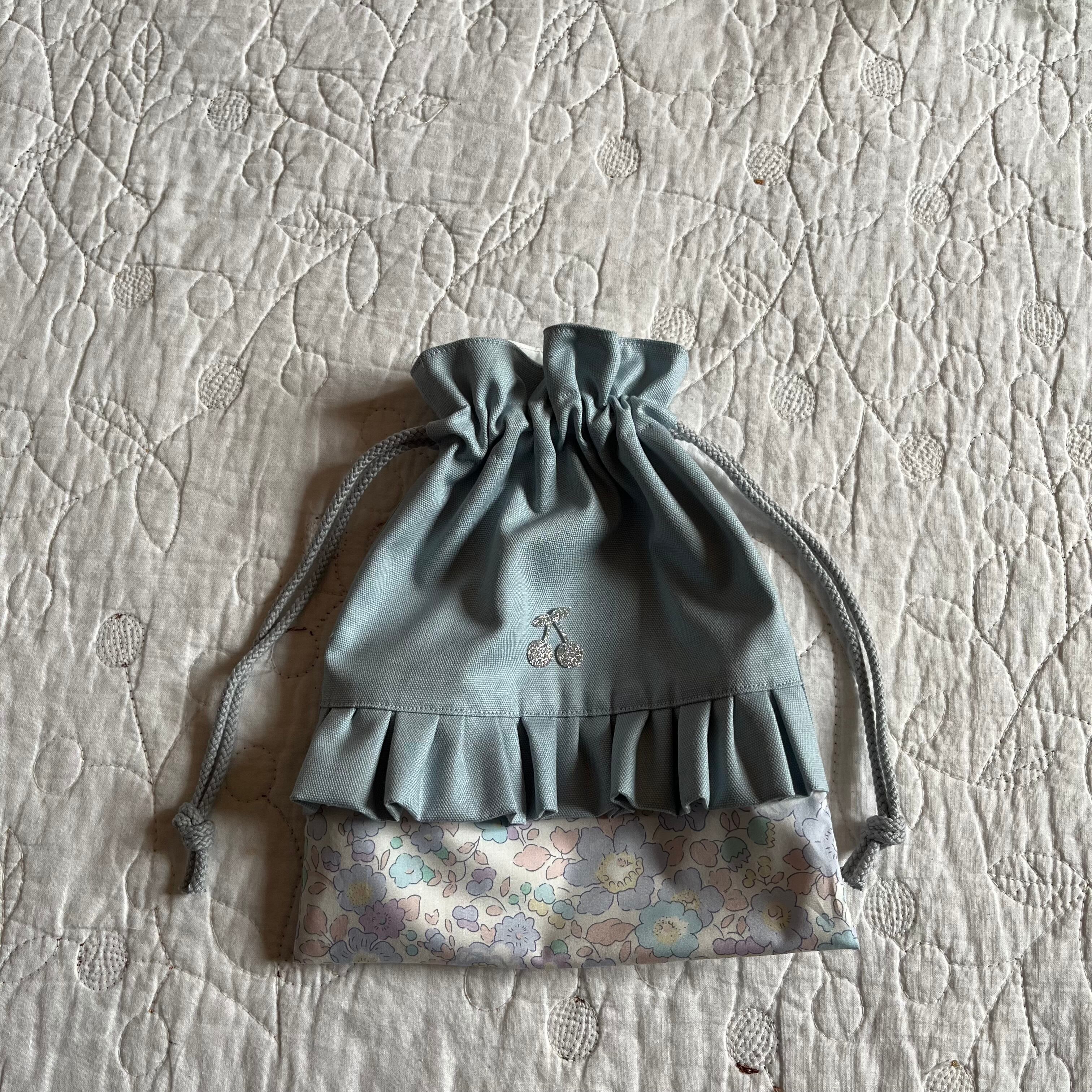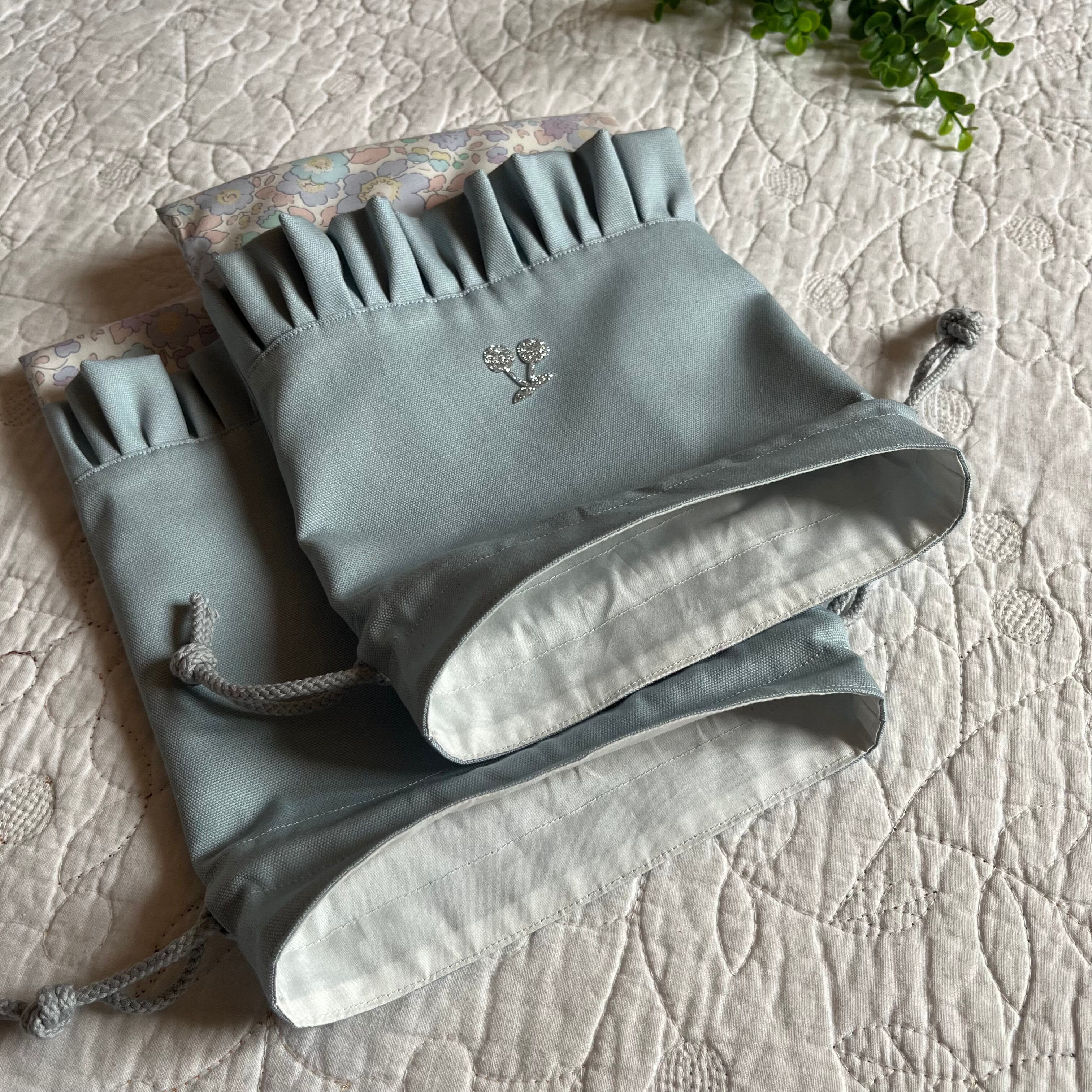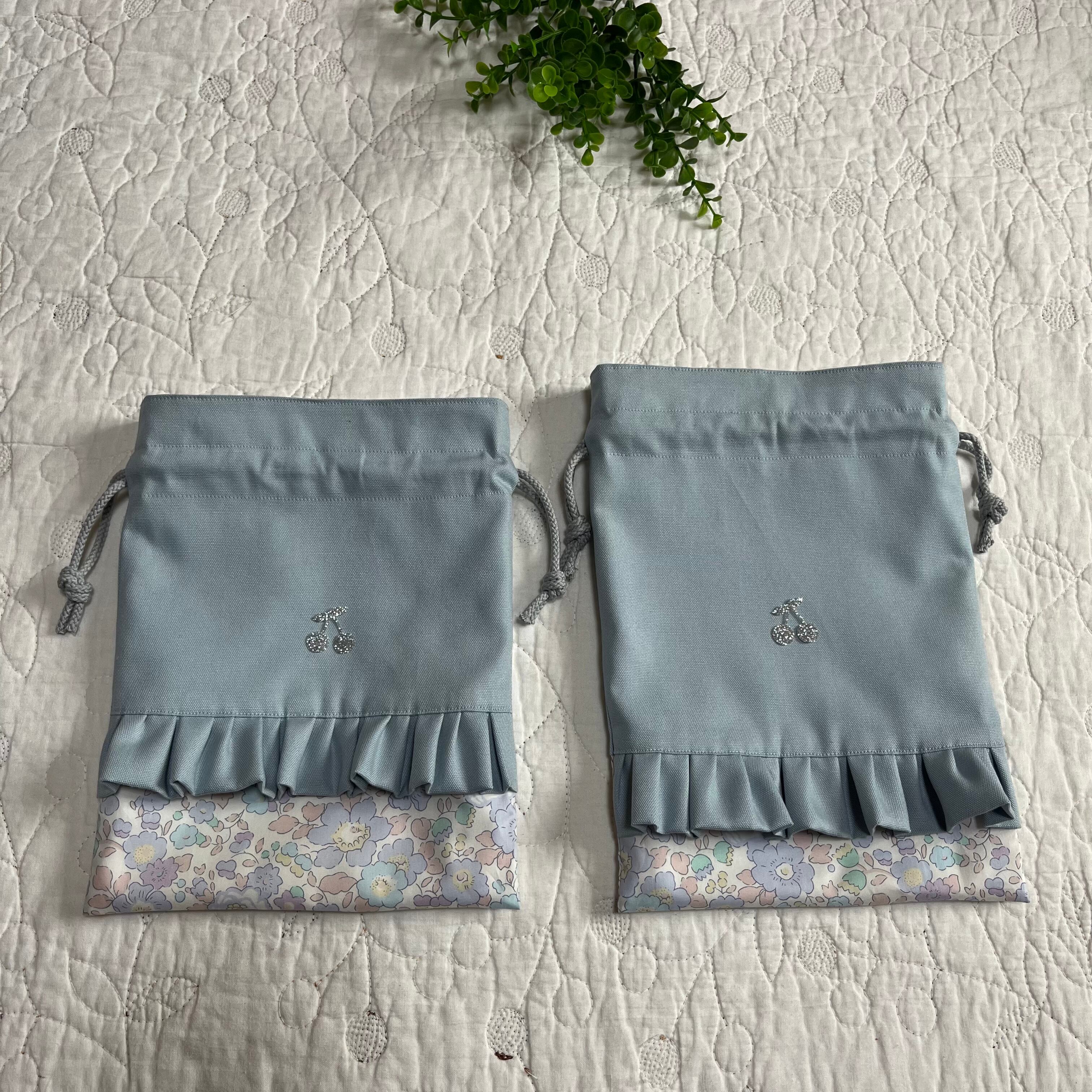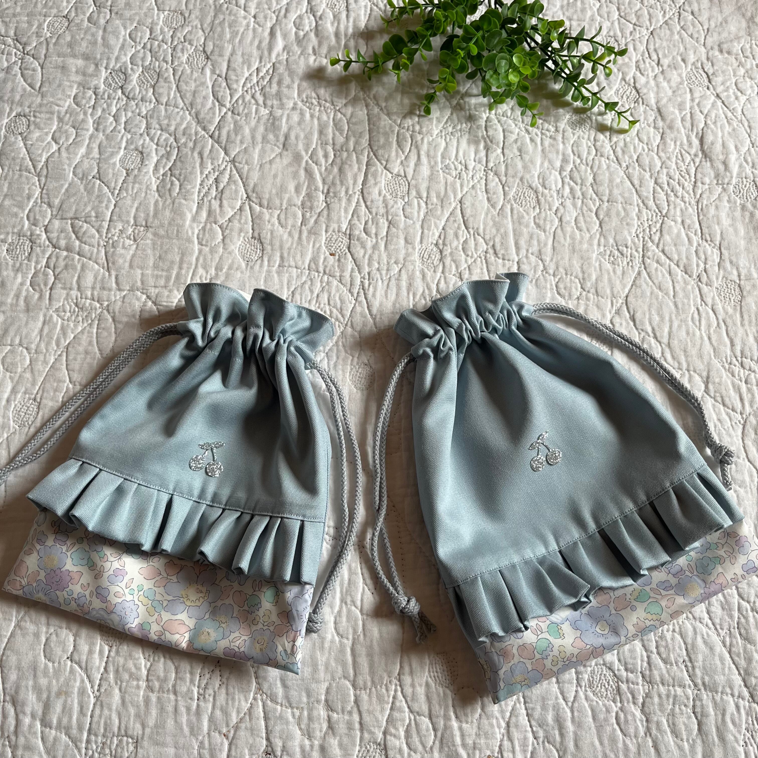 リバティ タナローン ベッツィ ラベンダー(メルシー)とオックス ブルーグレーで片面フリル付きデザインの巾着袋(コップ袋)を作製しました。
