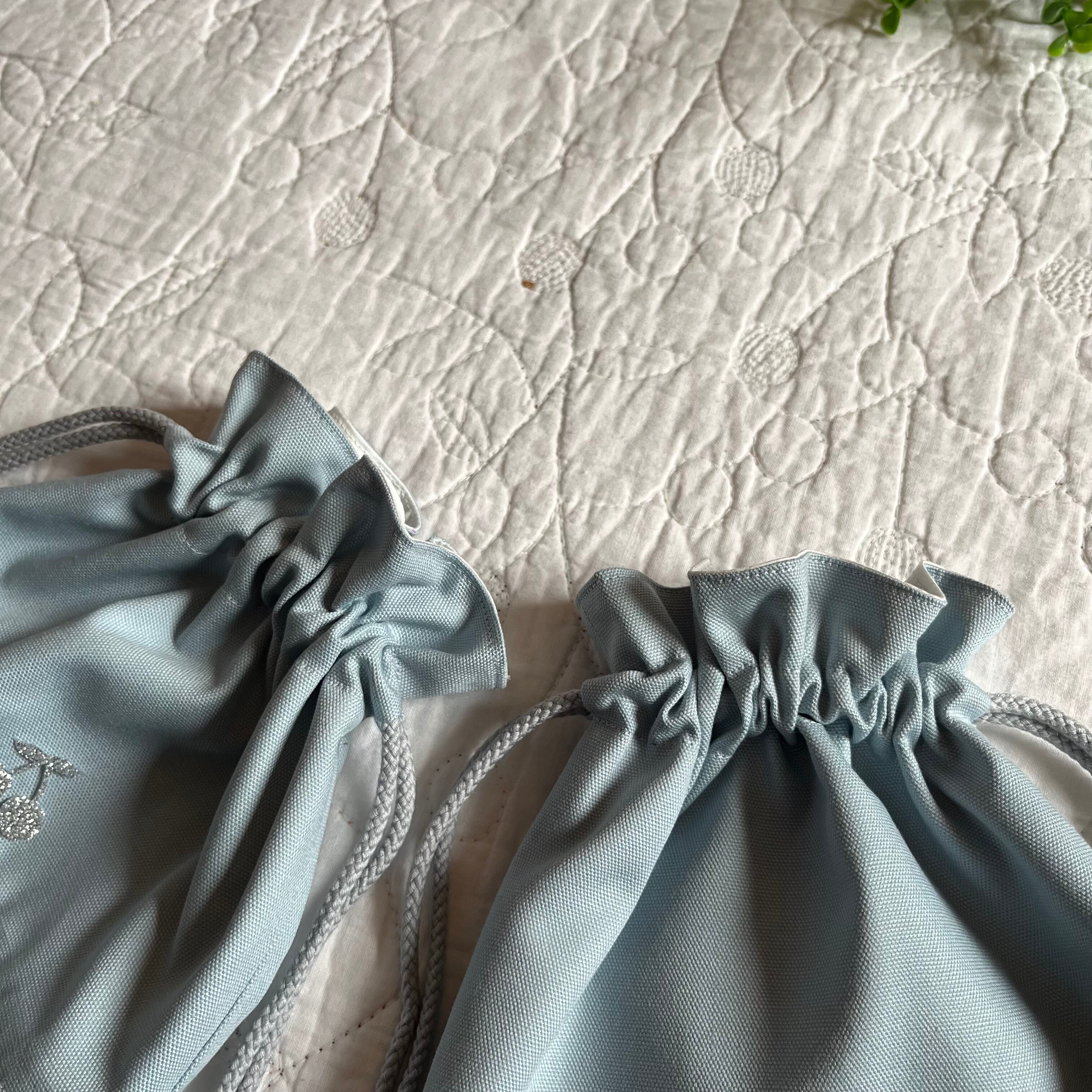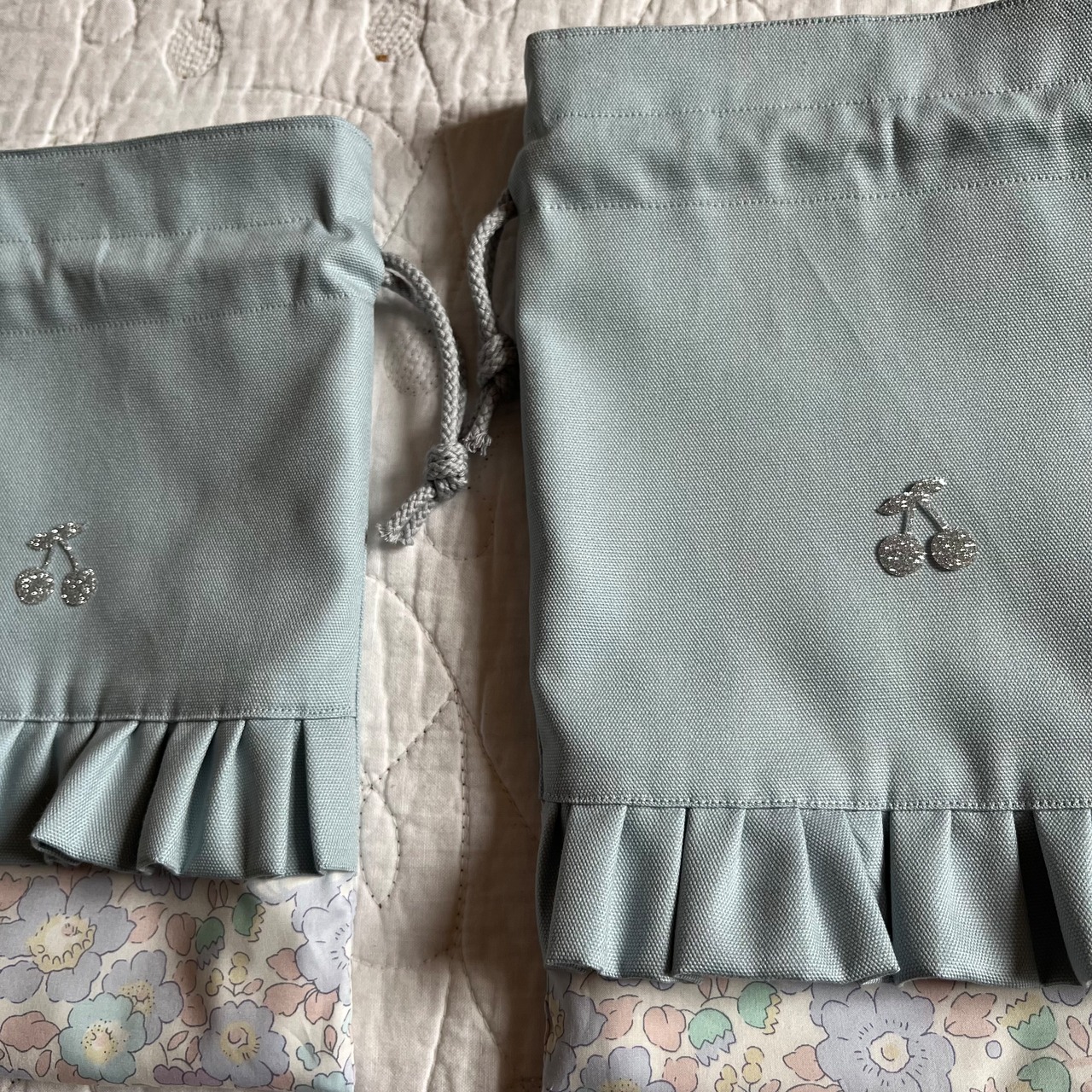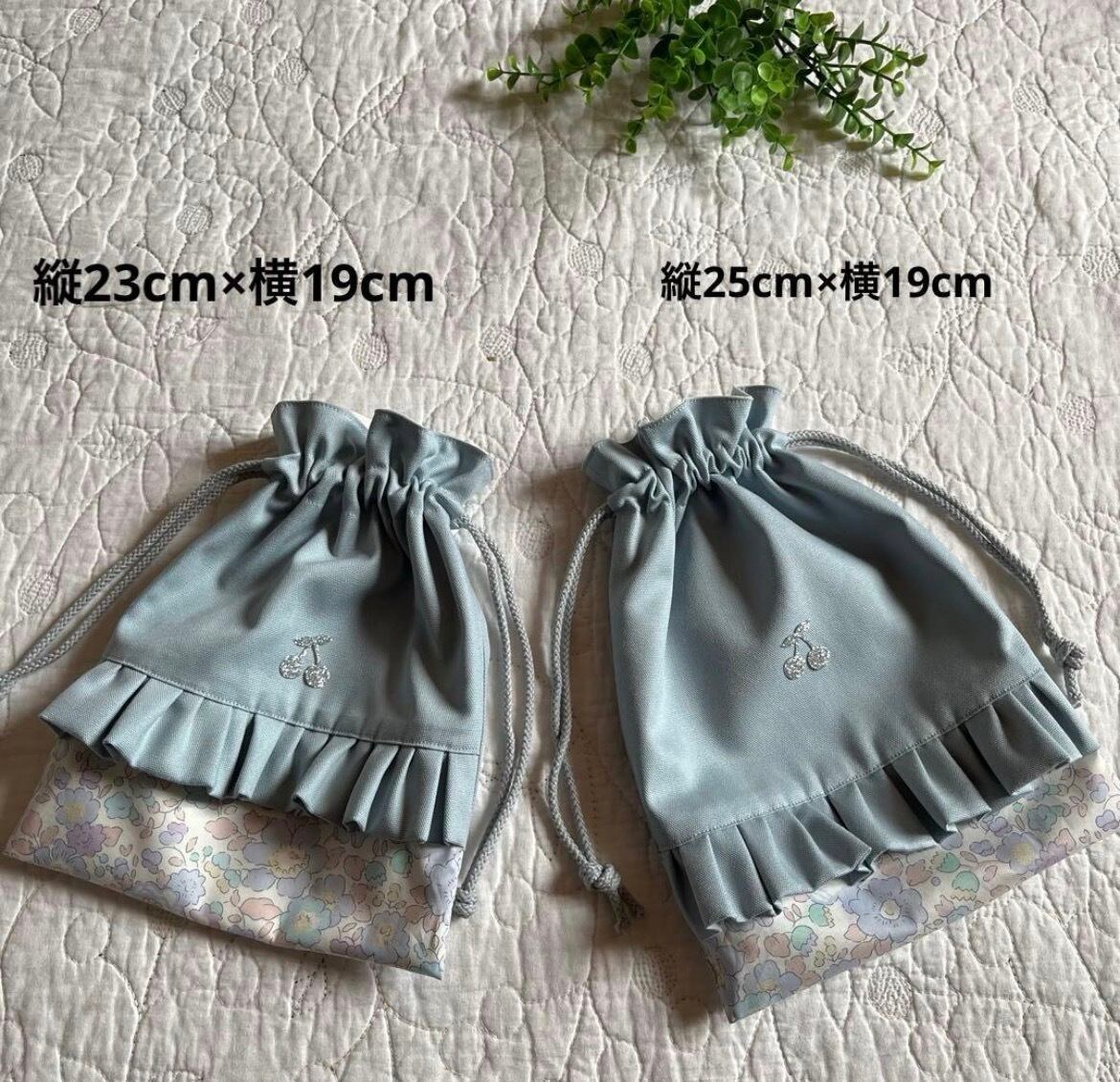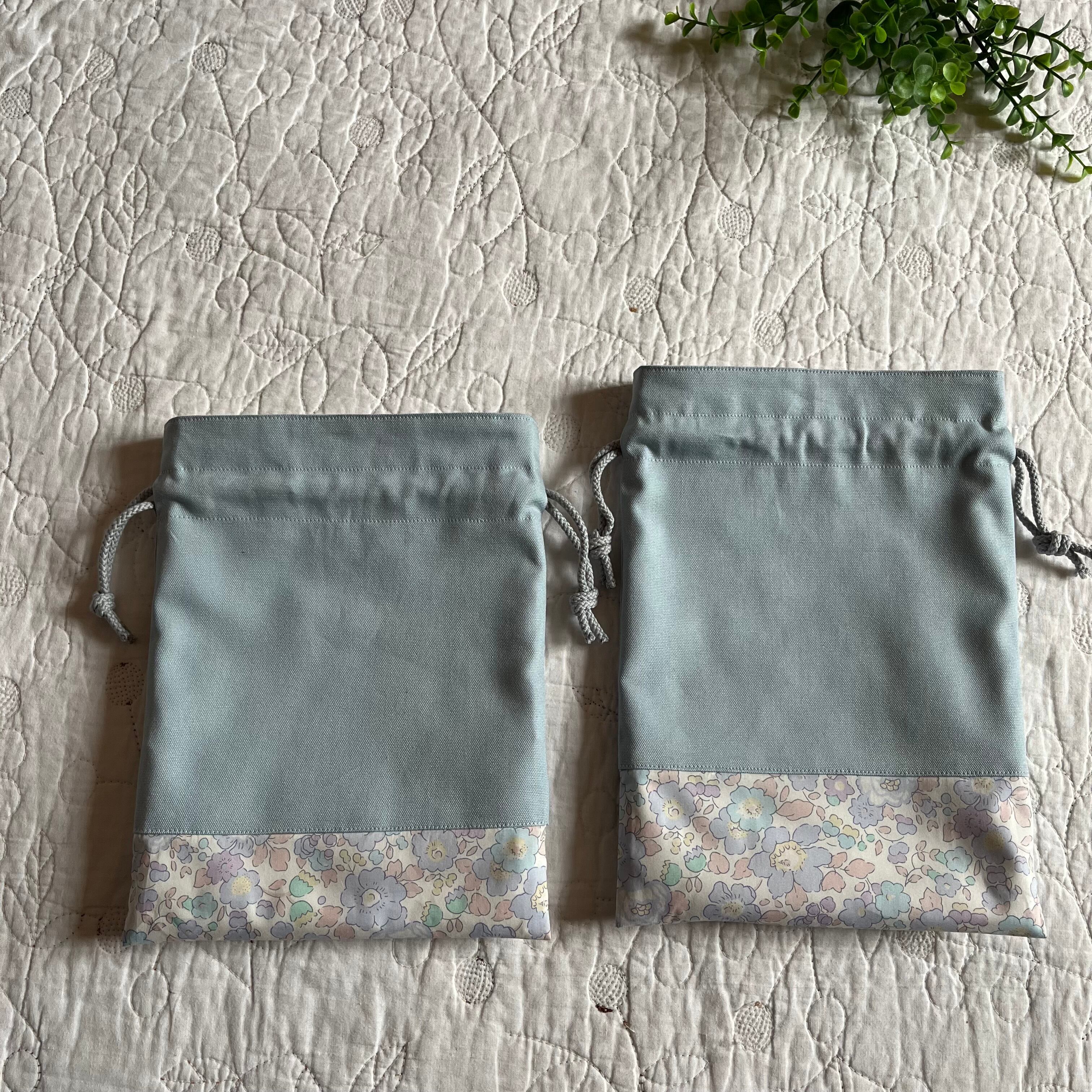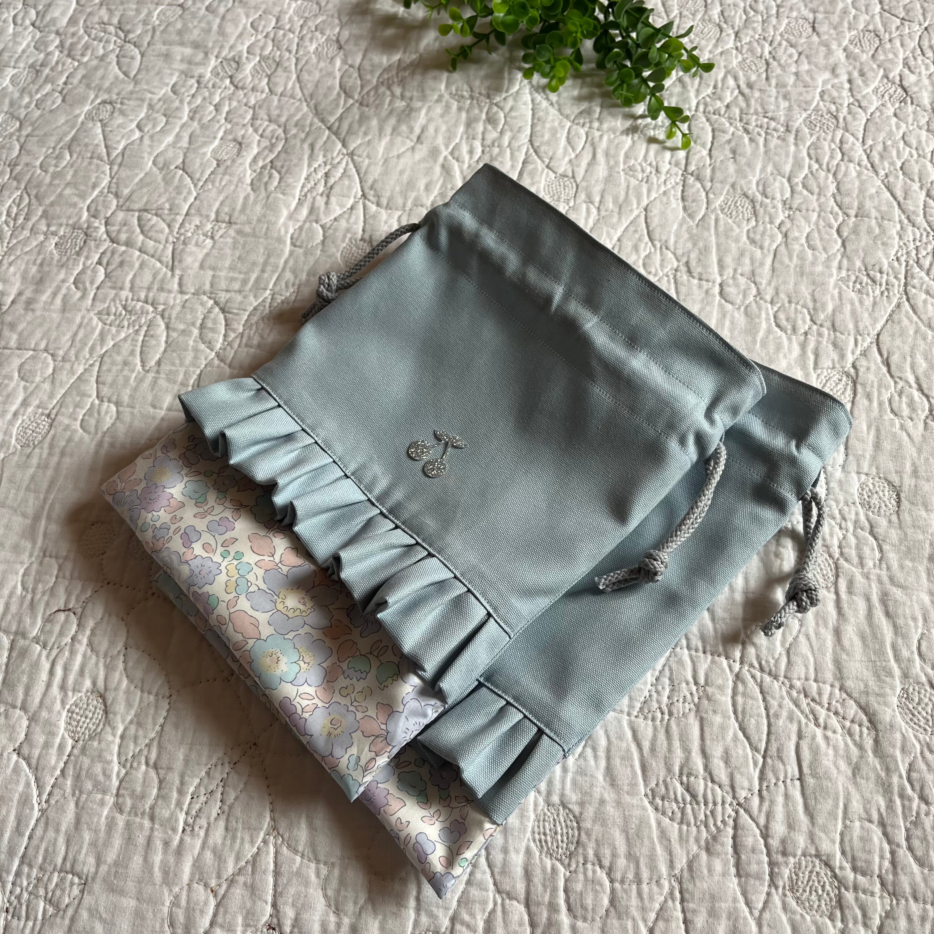 リバティ タナローン ベッツィ ラベンダー(メルシー)とオックス ブルーグレーで片面フリル付きデザインの巾着袋(コップ袋)を作製しました。
