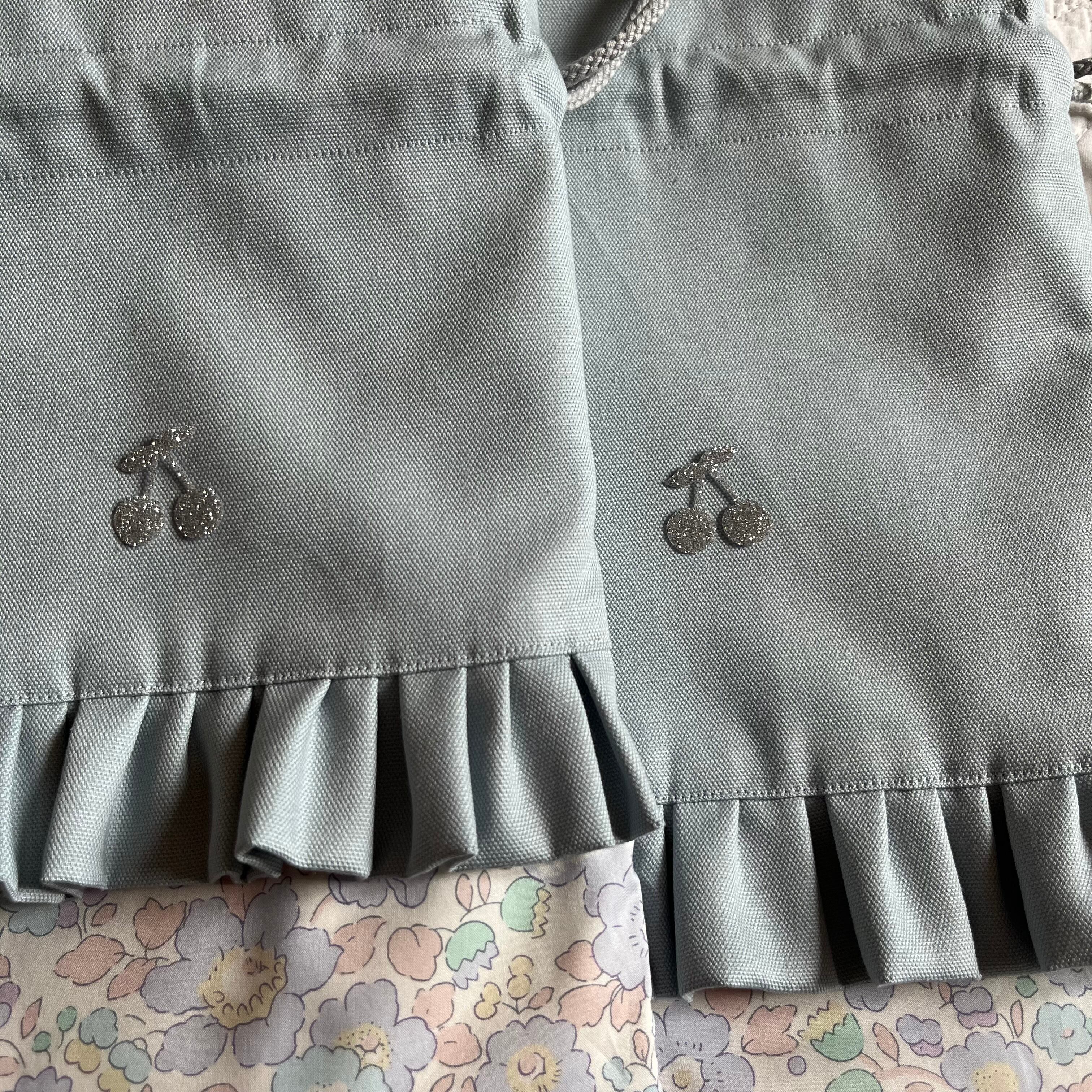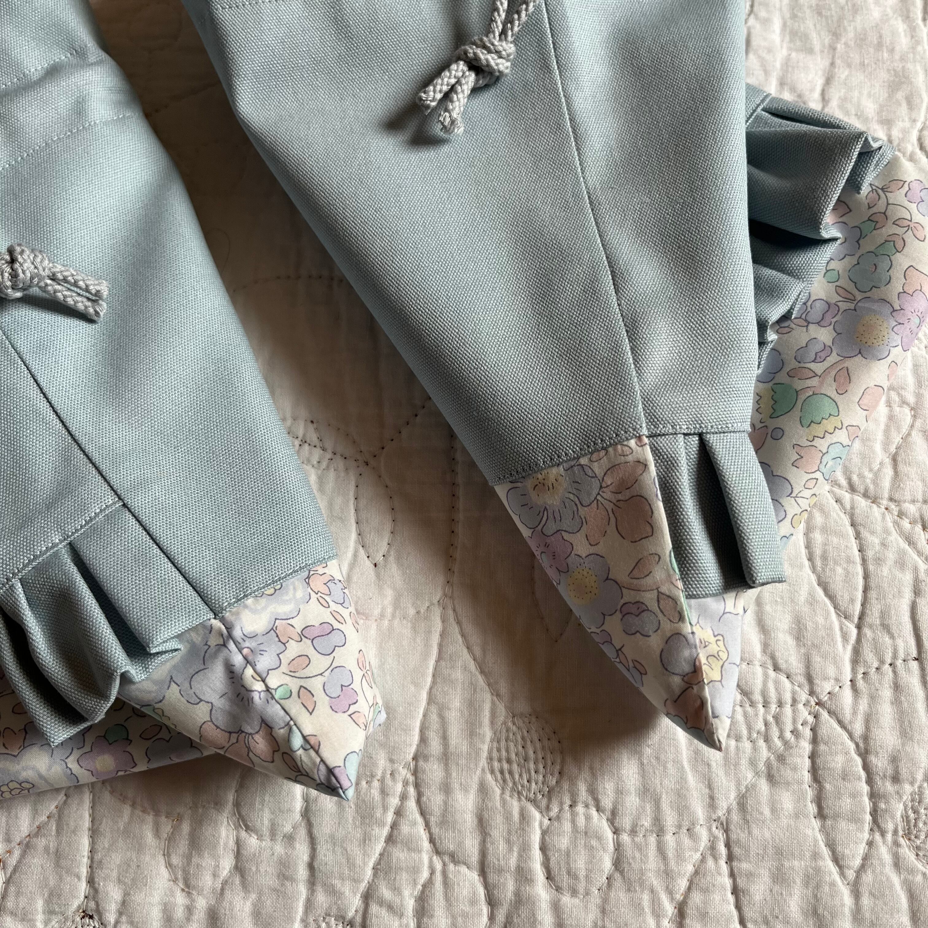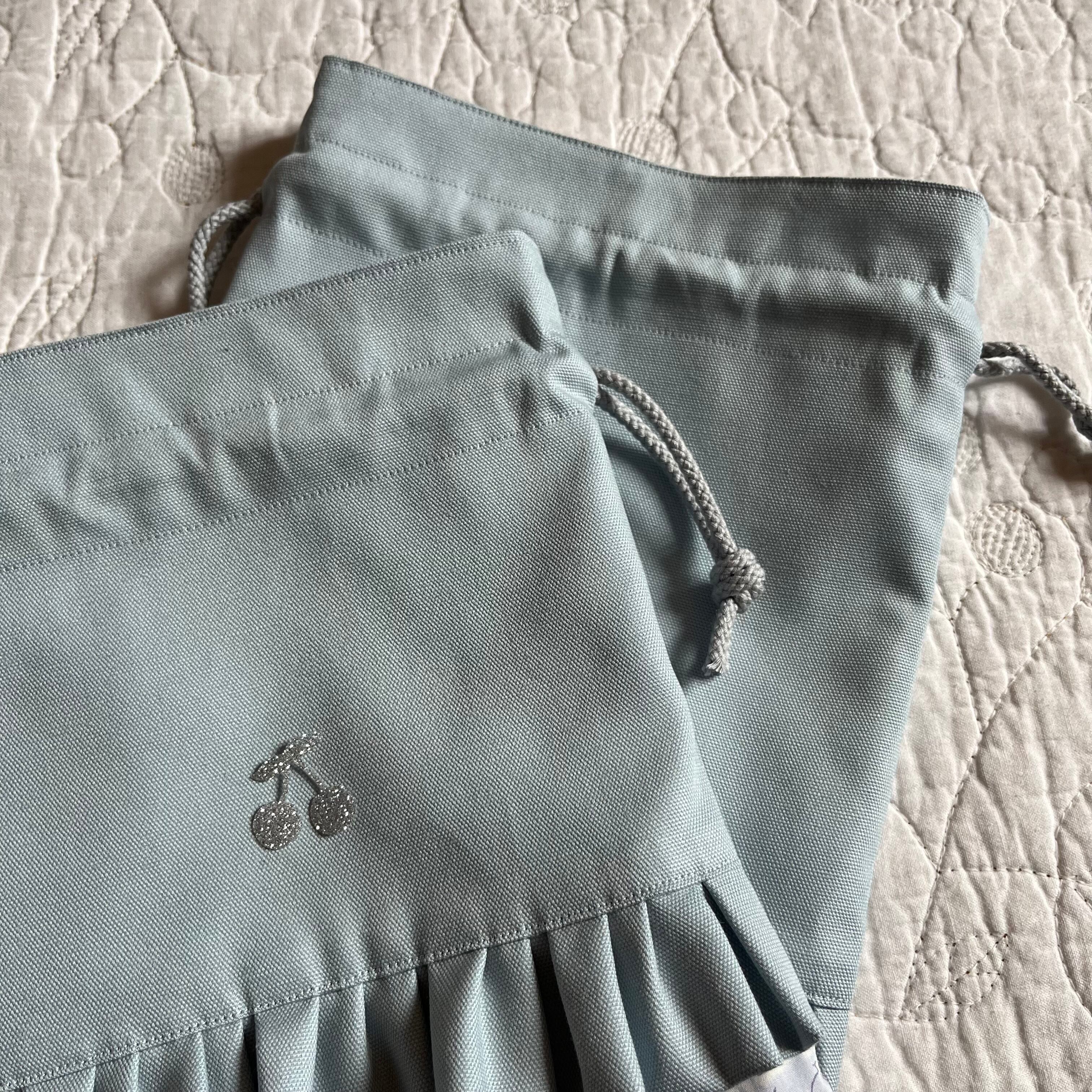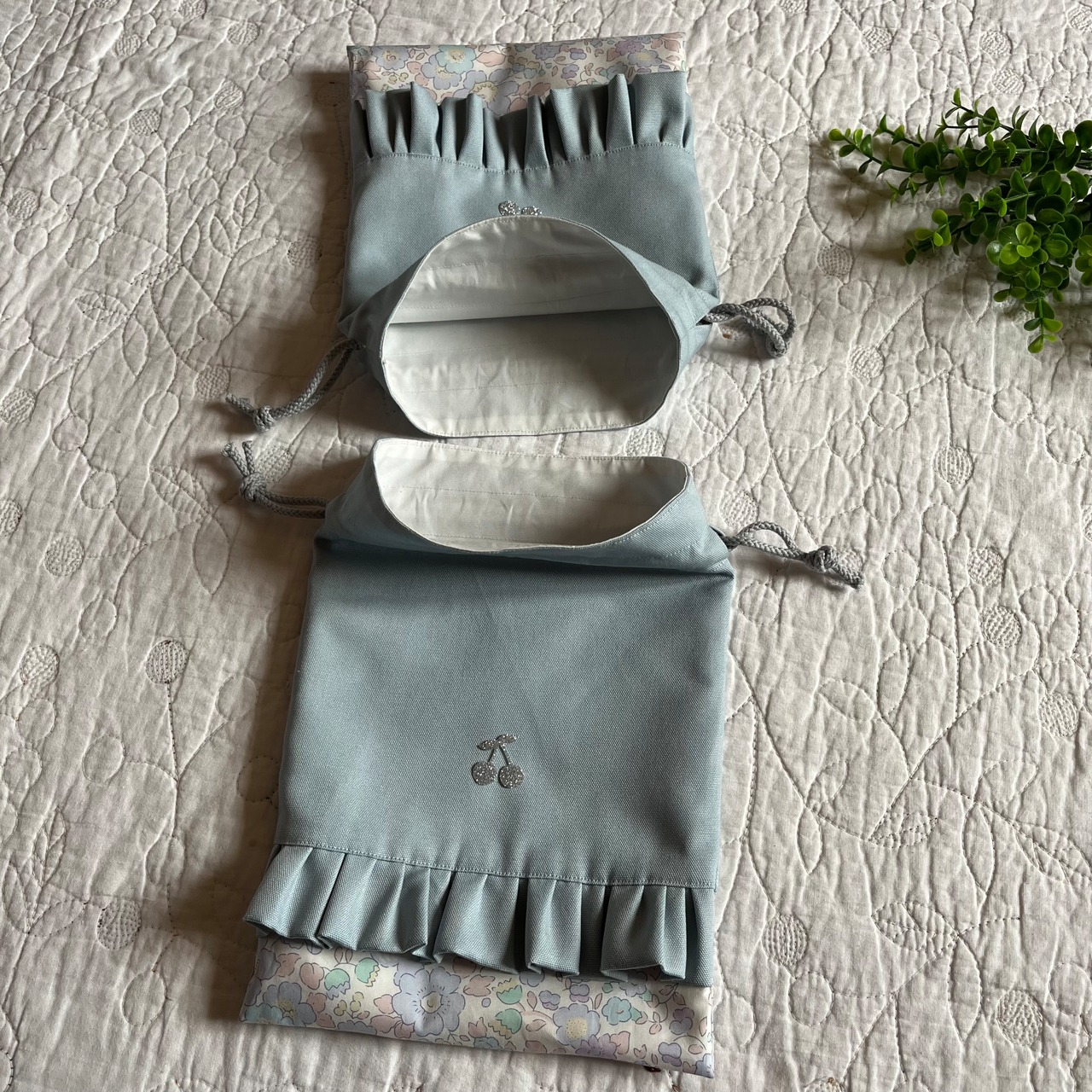 リバティ タナローン ベッツィ ラベンダー(メルシー)とオックス ブルーグレーで片面フリル付きデザインの巾着袋(コップ袋)を作製しました。