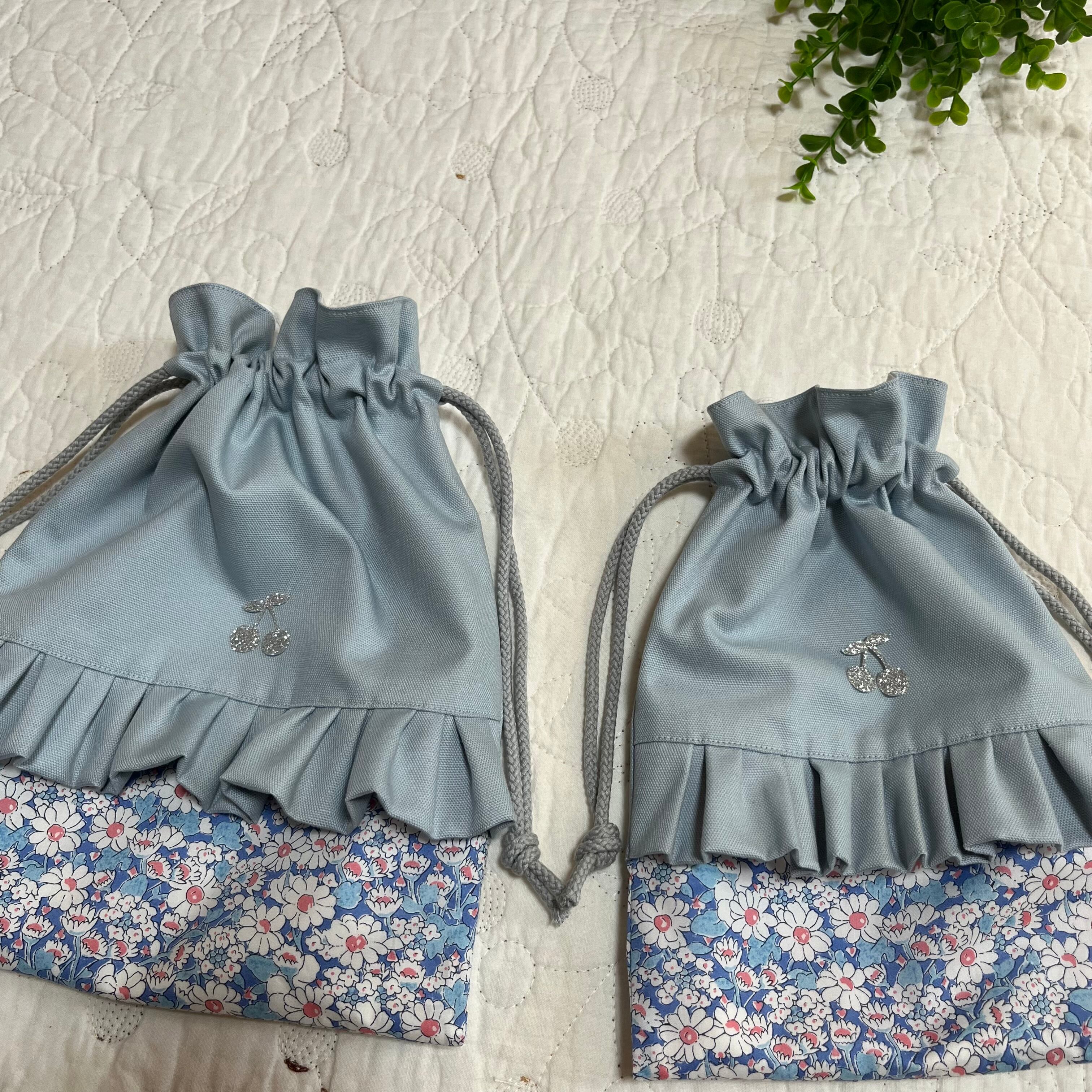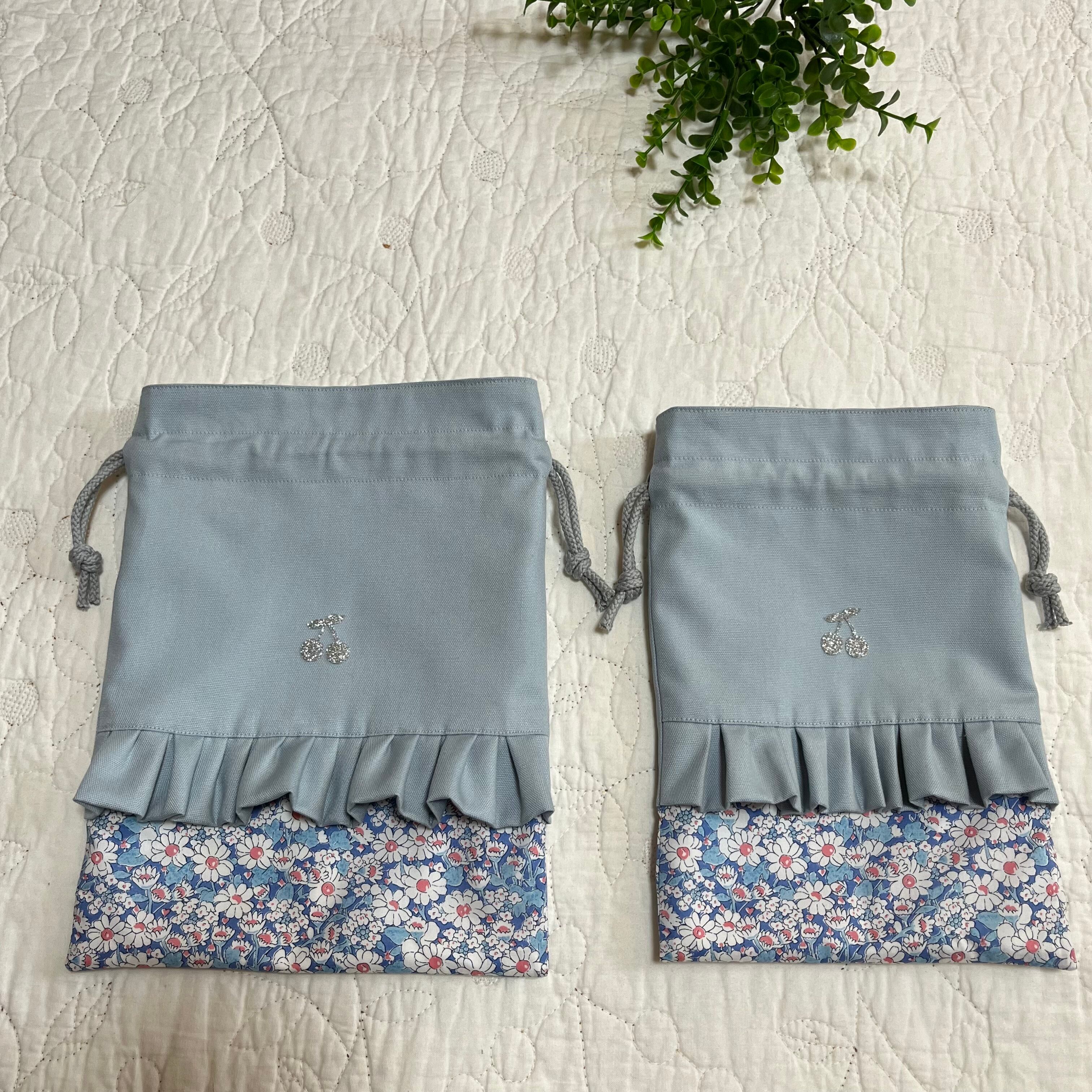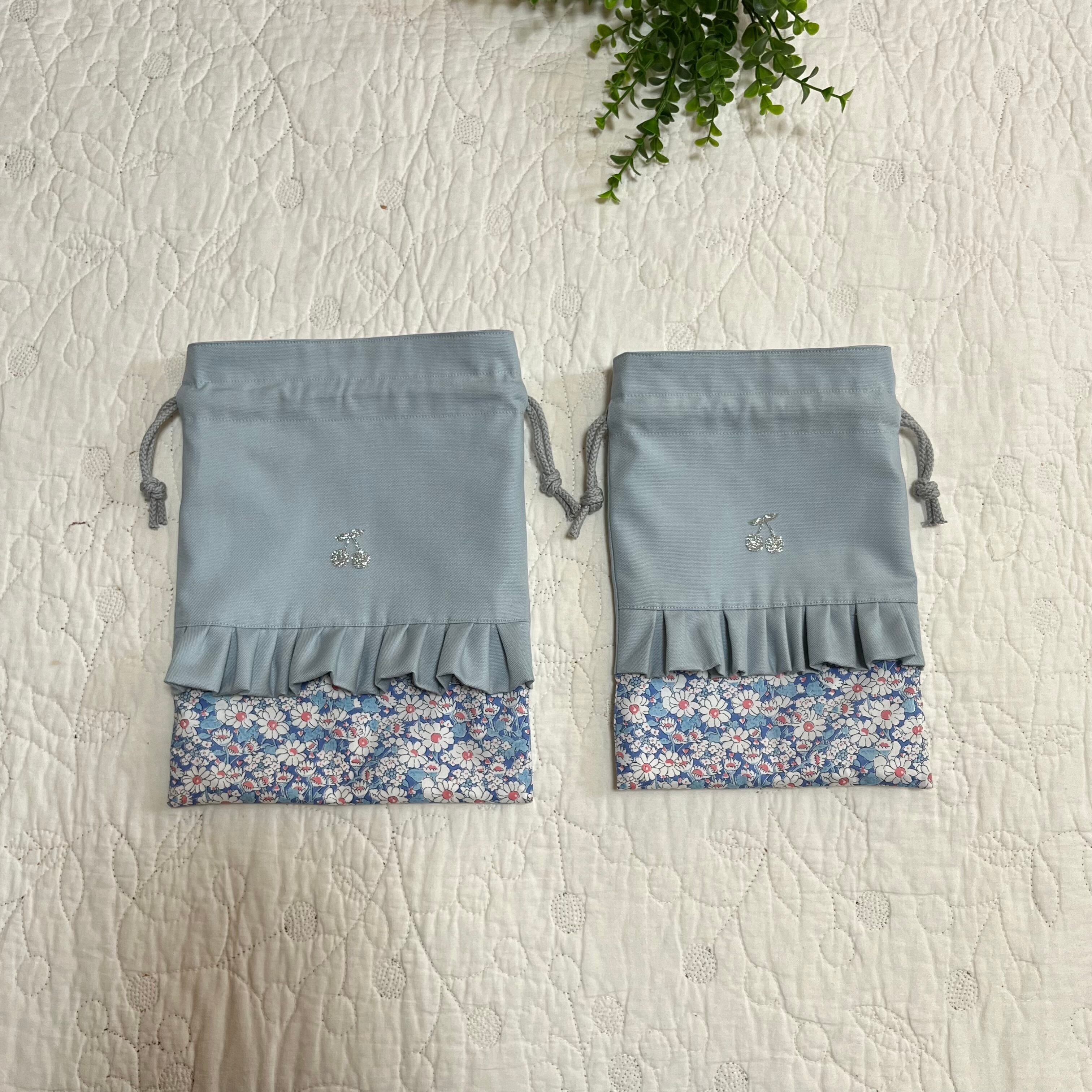 リバティ タナローン アリスwブルーとオックス ブルーグレーで片面フリル付きデザインの巾着袋(コップ袋)を作製しました。