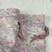 リバティ タナローン ベッツィ ピンクパープル(ユザワヤ)と海のブロード ラベンダー(c&s)で片面フリル付きデザインのお弁当袋とコップ袋を作製しました。