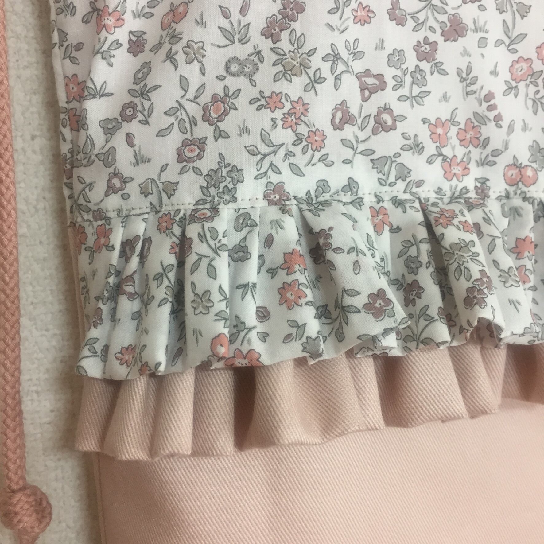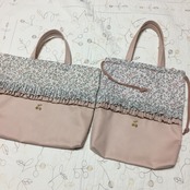 リバティ タナローン メドゥスイート フレンチカラーで2重フリル付きのレッスンバックと持ち手付き巾着(体操服入れ、お着替え袋)を作製しました