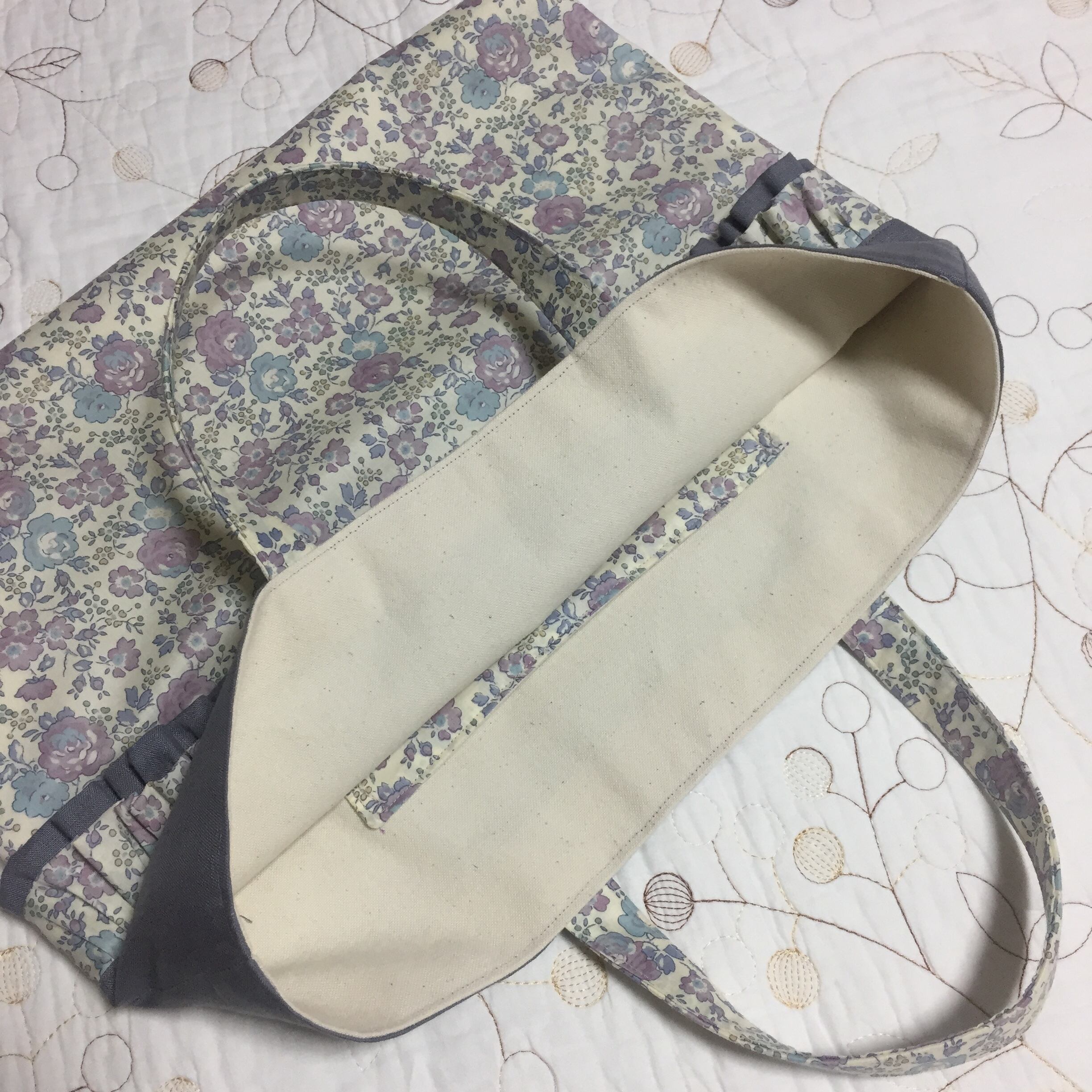 リバティ タナローン フェリシテ ラベンダー系(c&s)とやさしいリネン ラベンデューラを使いレッスンバッグを作製しました。裏地は11号帆布を使用しています。