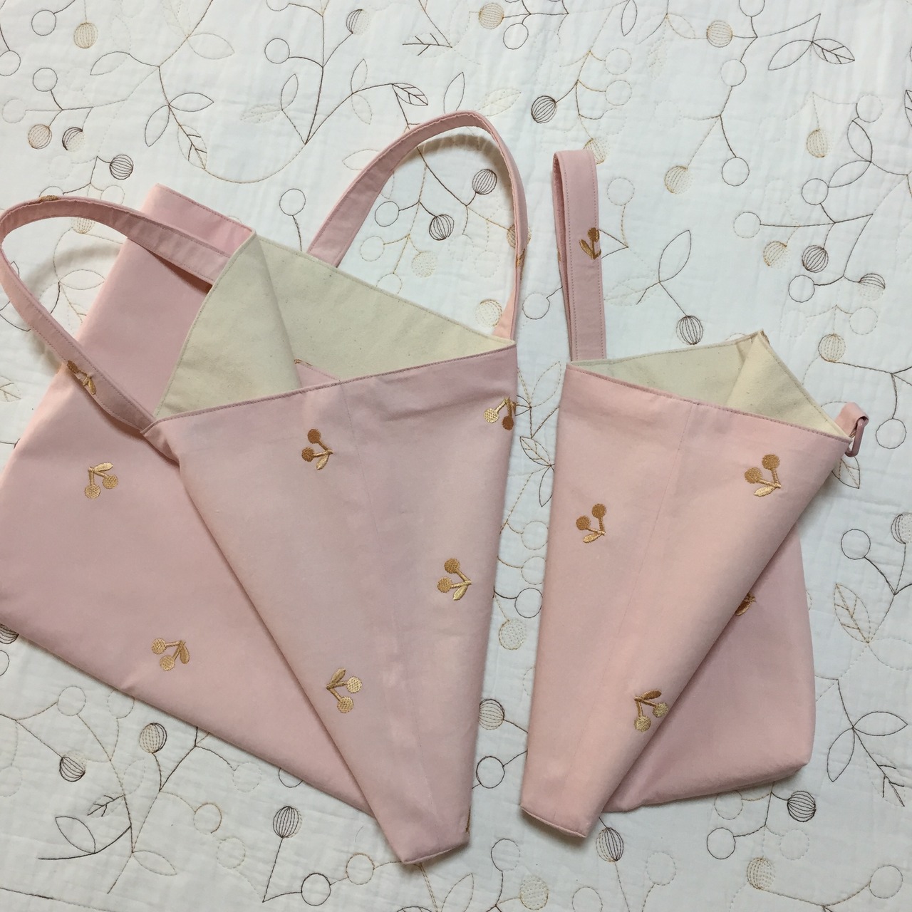 ハンドメイド レッスンバッグ さくらんぼ刺繍 上履き入れ 2点セット 入園入学準備 通園準備