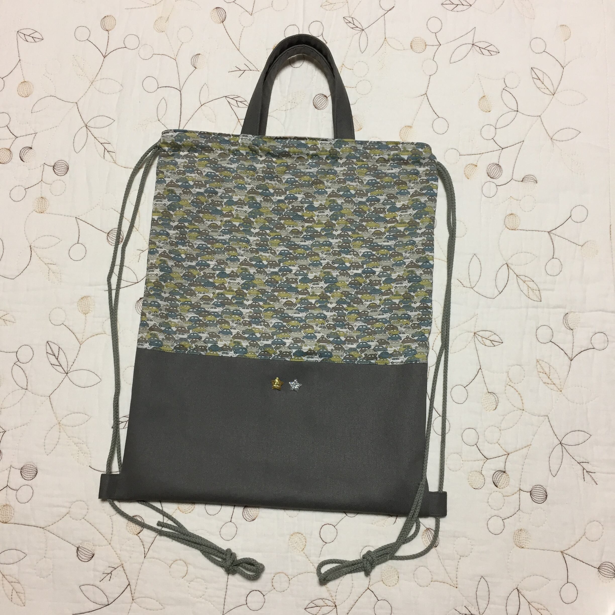 リバティタナローン カーズとツイル カーキグレーでナップサックを作製しました。