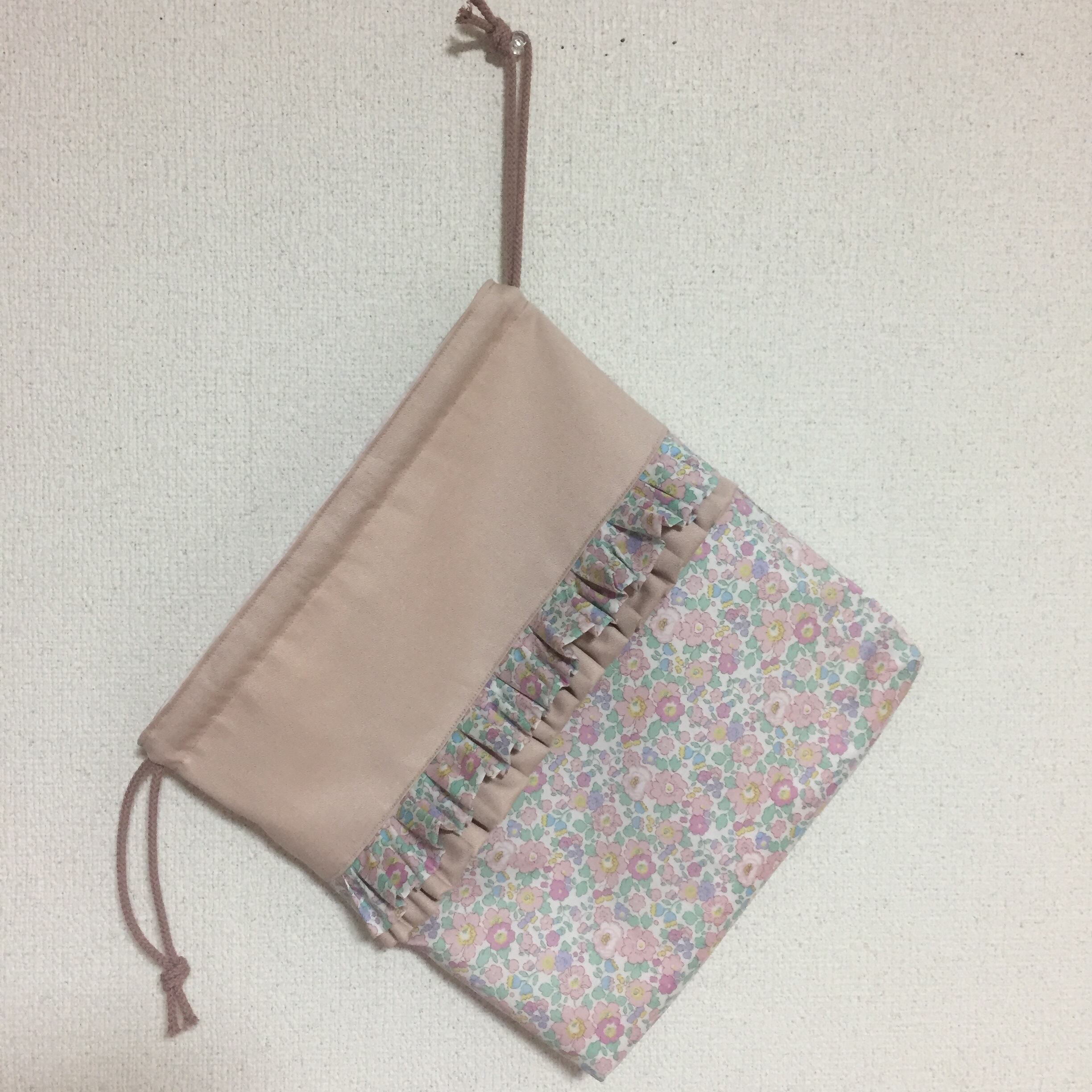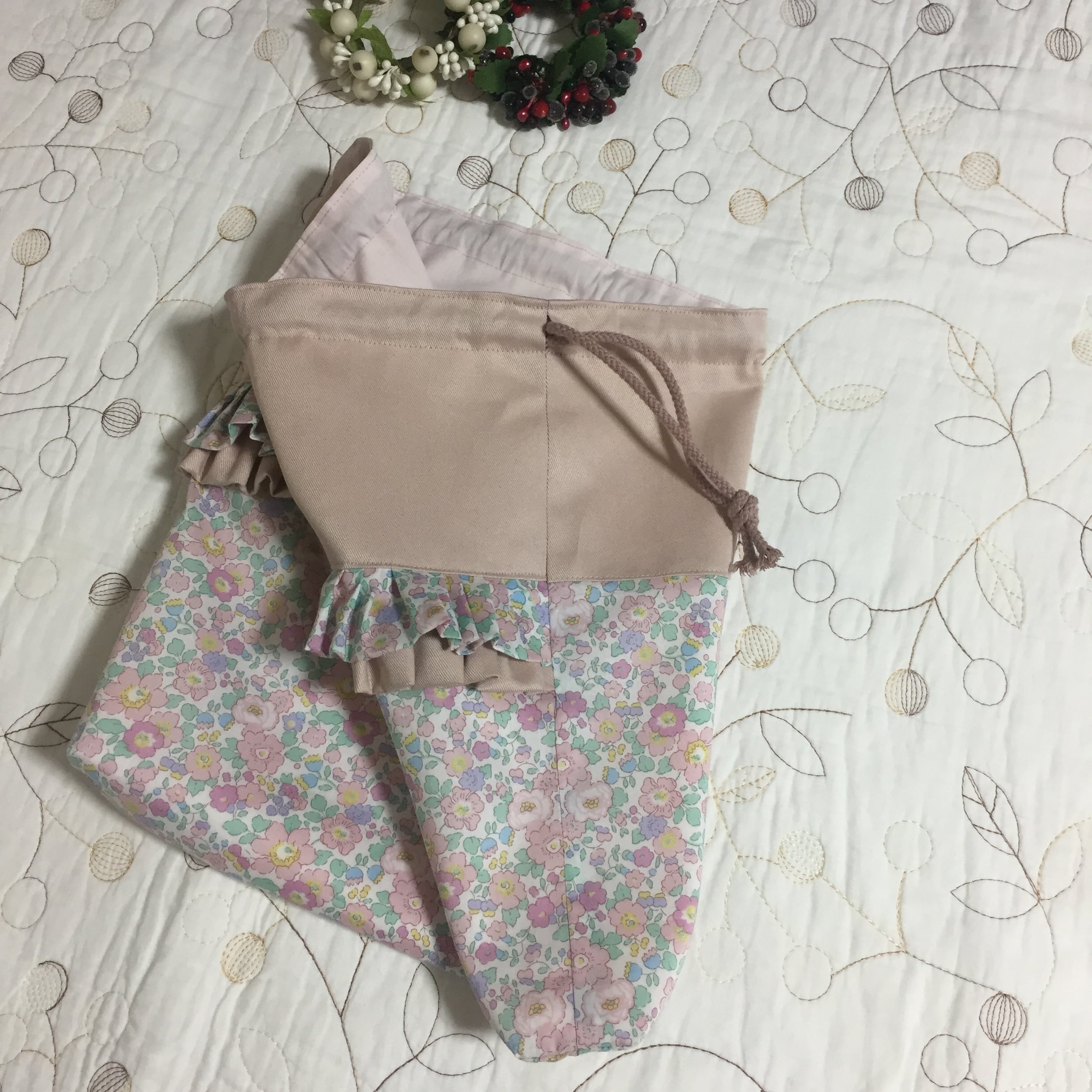 リバティ タナローン ベッツィ 66P(ホビーラホビーレ)とツイルくすみのピンクで片面2重フリル付きの巾着袋を作製しました。