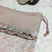 リバティ タナローン ベッツィ ピンクラベンダー(チェックアンドストライプ)とツイルくすみのピンクで片面2重フリル付きの巾着袋を作製しました。