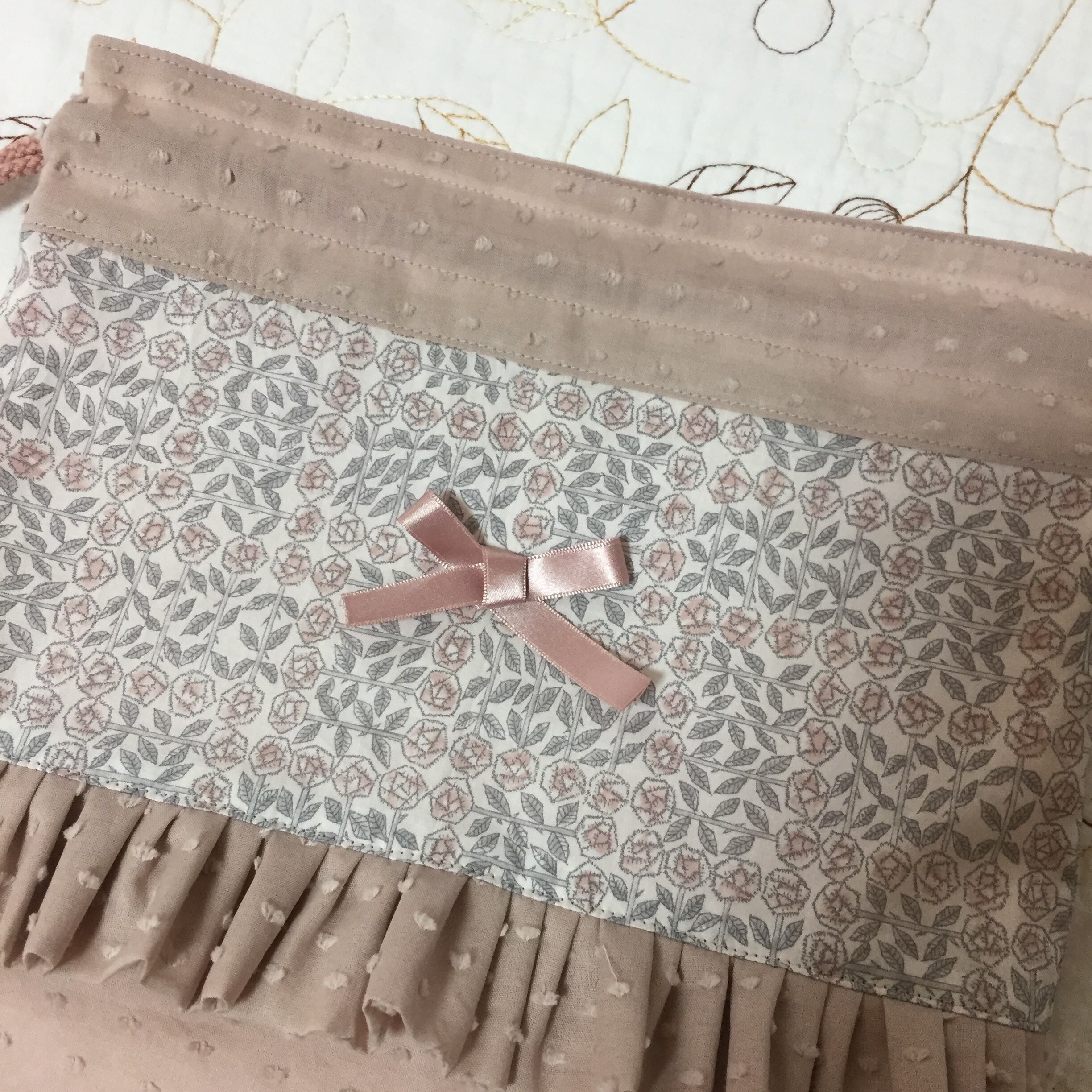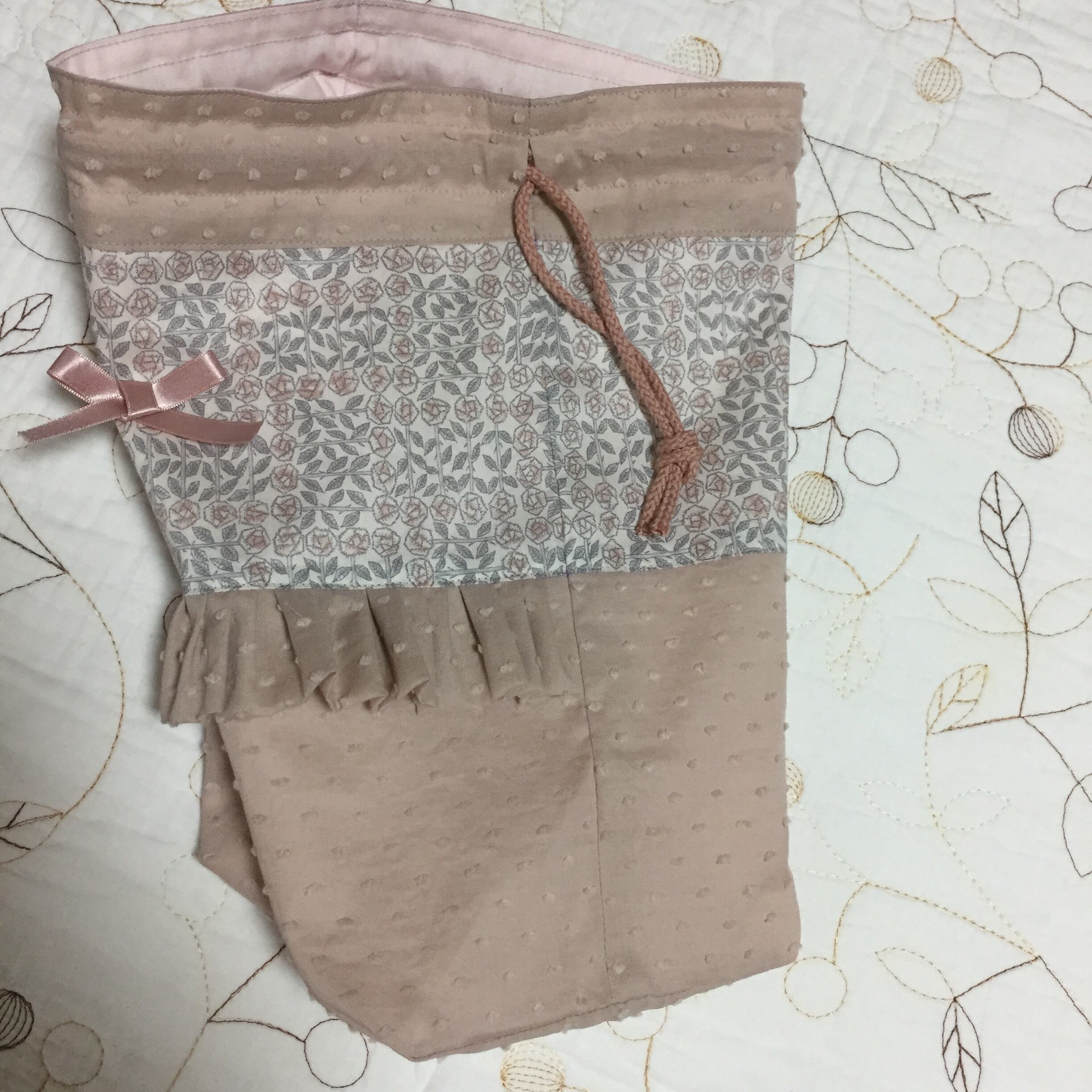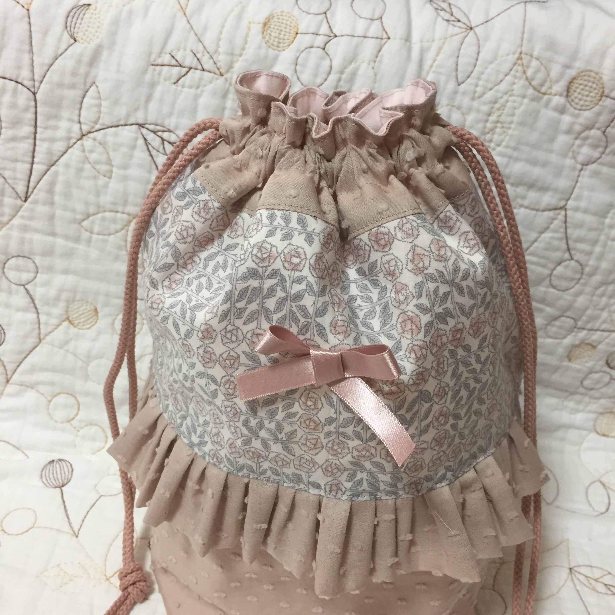 リバティ タナローン スリーピングローズ (メルシー限定色)と海のブロード グレイッシュピンク (チェックアンドストライプ)で巾着袋を作製しました。