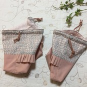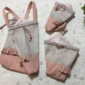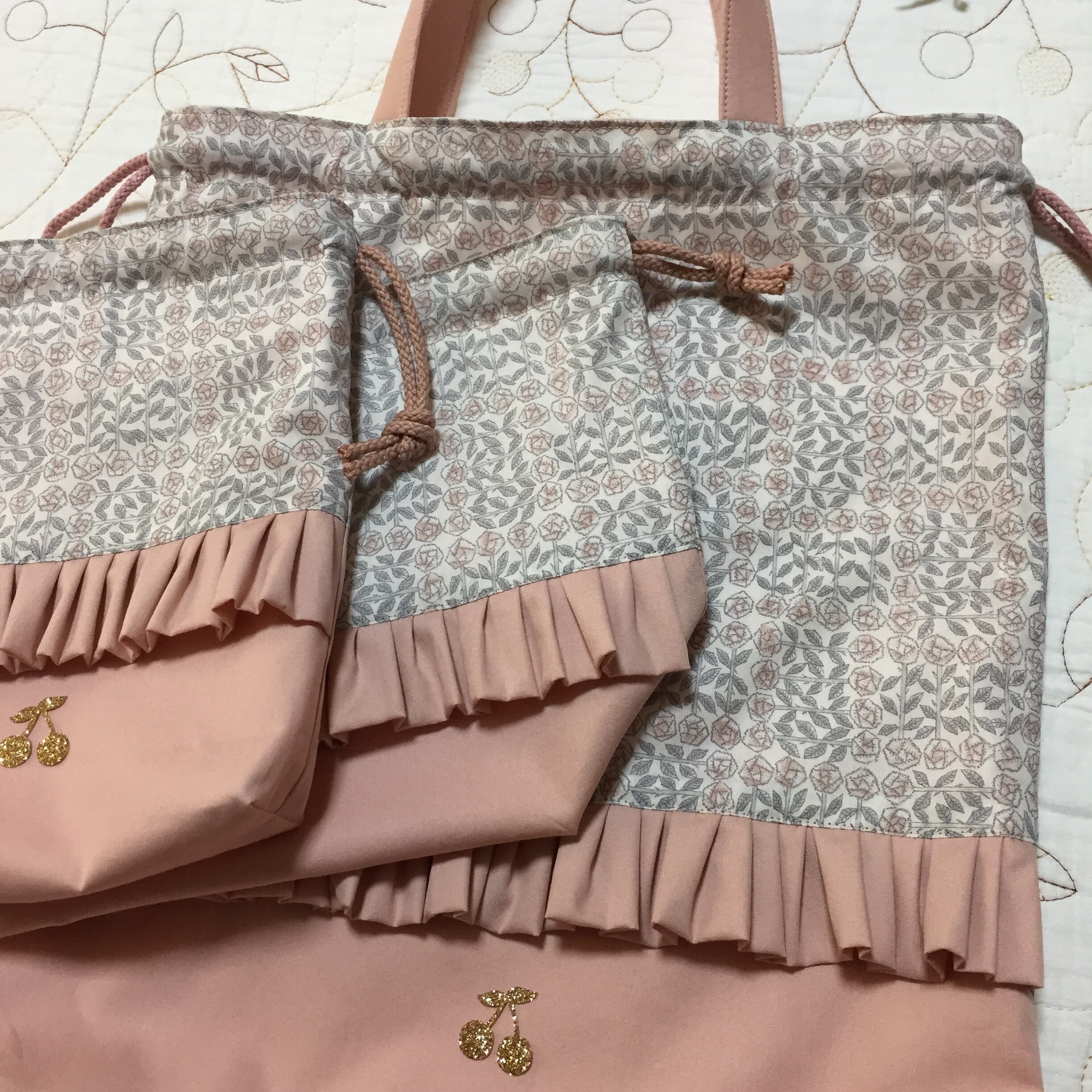 リバティ タナローン スリーピングローズ(メルシー)で 持ち手付き巾着袋、お弁当袋、コップ袋を作製しました。