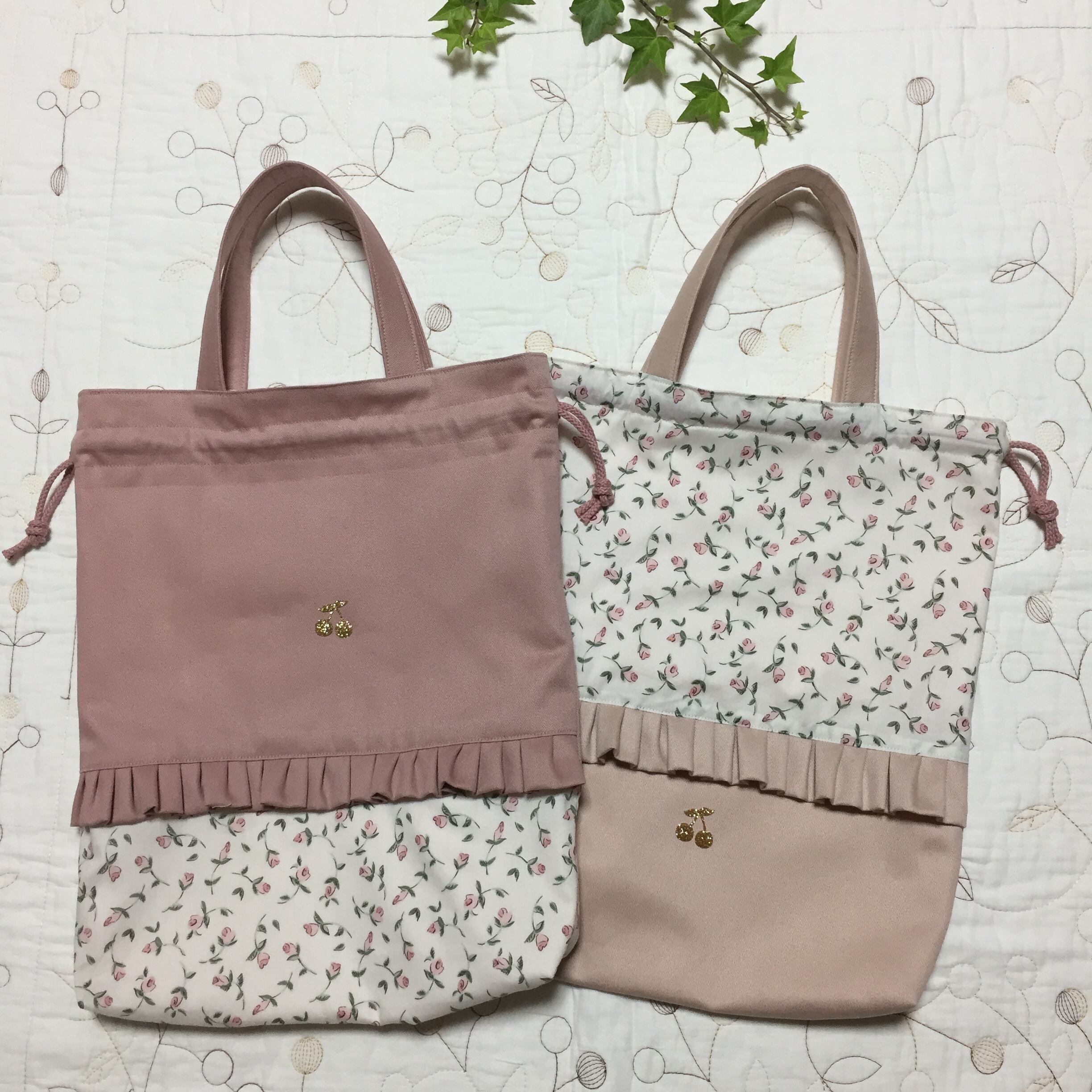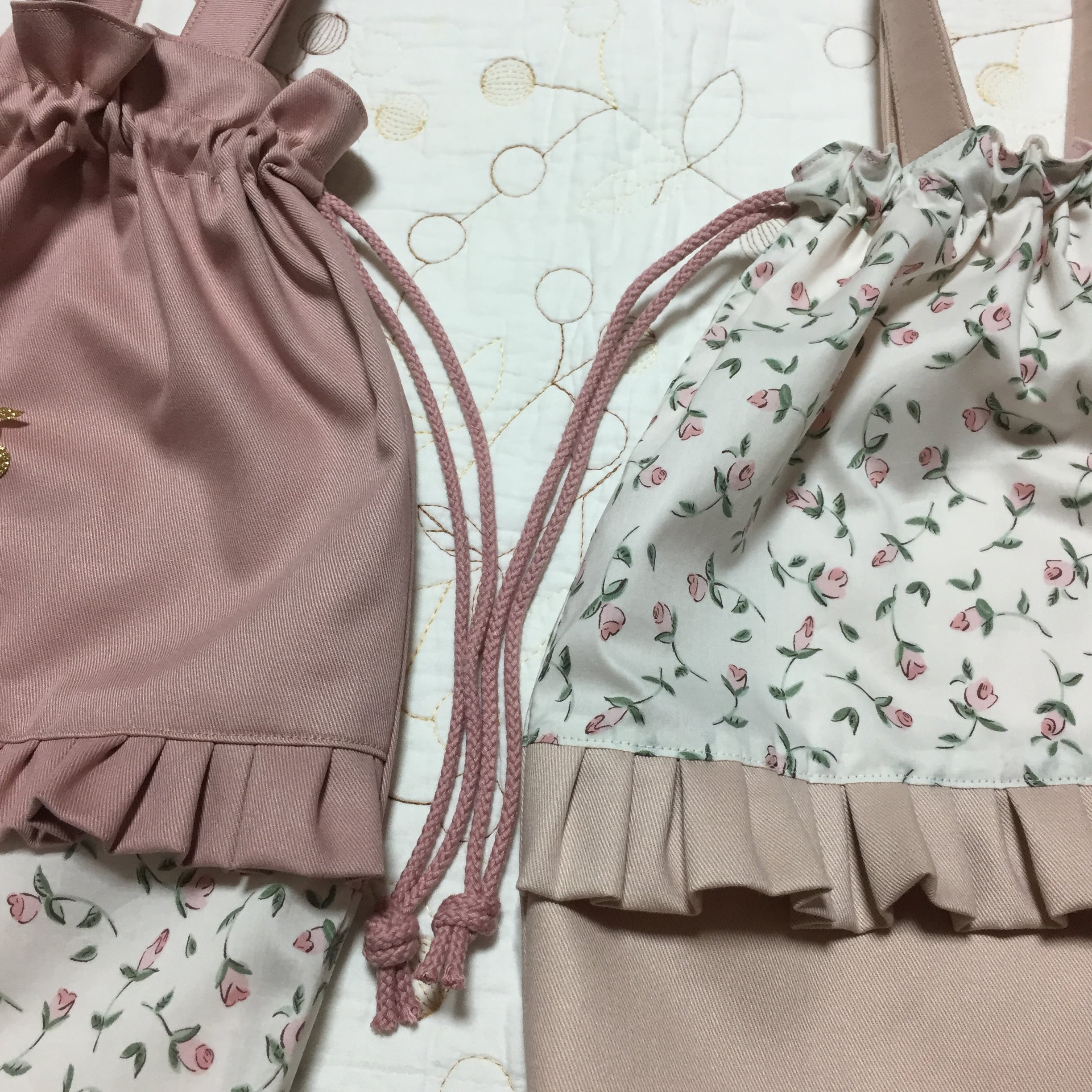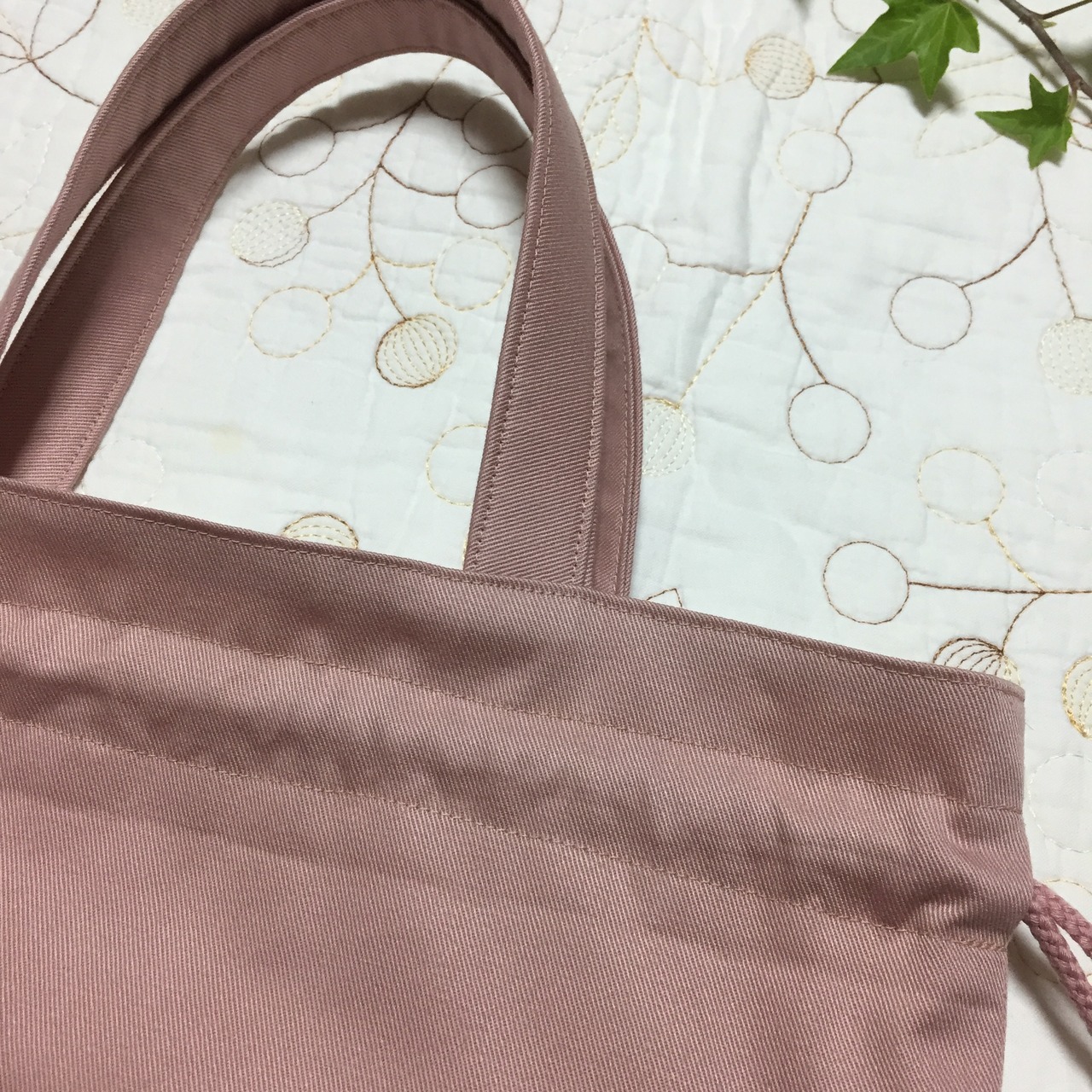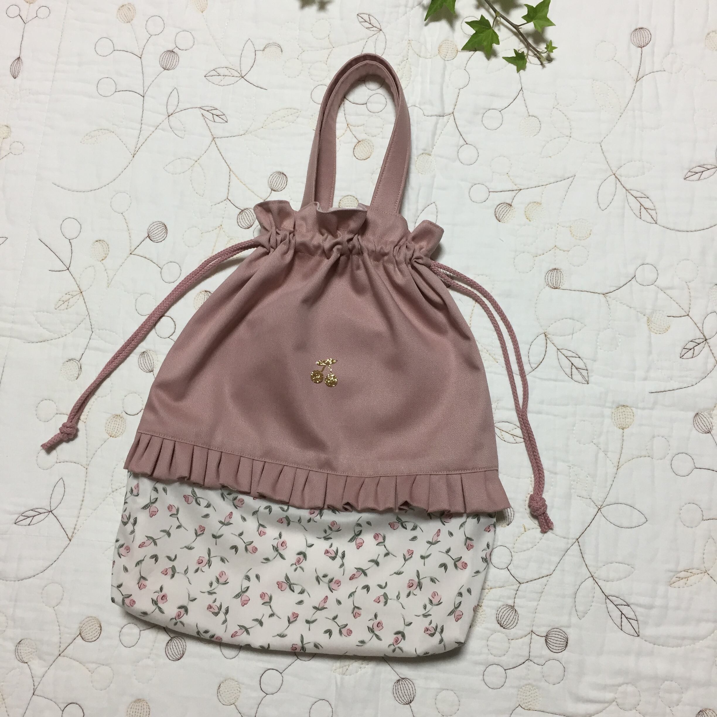 リバティ タナローン フローティングフローラ ピンク(チェックアンドストライプ)とツイル ピンクラベンダーで持ち手付き巾着を作製しました