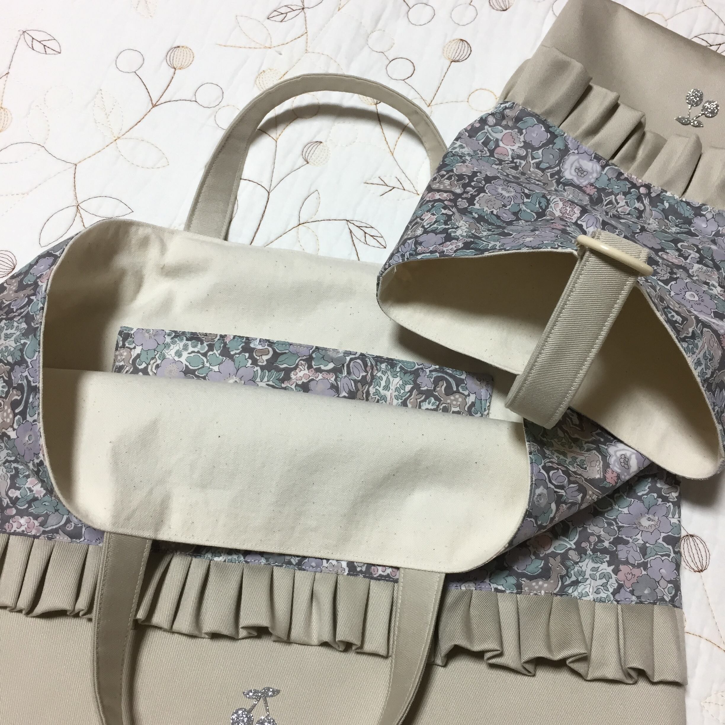 *リバティ タナローン ウッドランドベッツィ (チェックアンドストライプ限定色)とツイル アイボリーでレッスンバッグと上履き入れ、お着替え袋を作製しました。