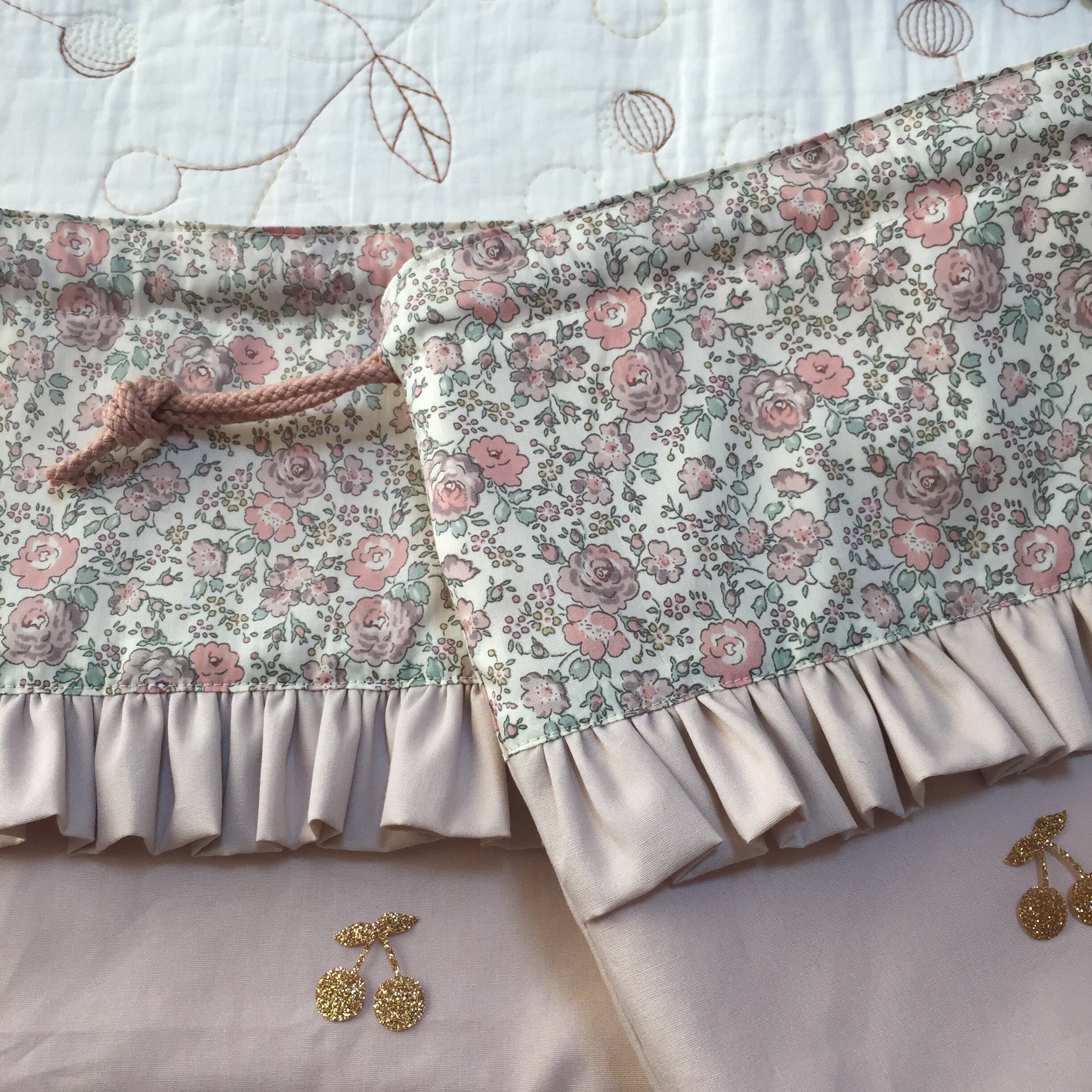 リバティ タナローン フェリシテ プティあずきミルク(チェックアンドストライプ)と海のブロード グレイッシュピンク(C&S)で片面フリル付きお弁当袋とコップ袋を作製しました。