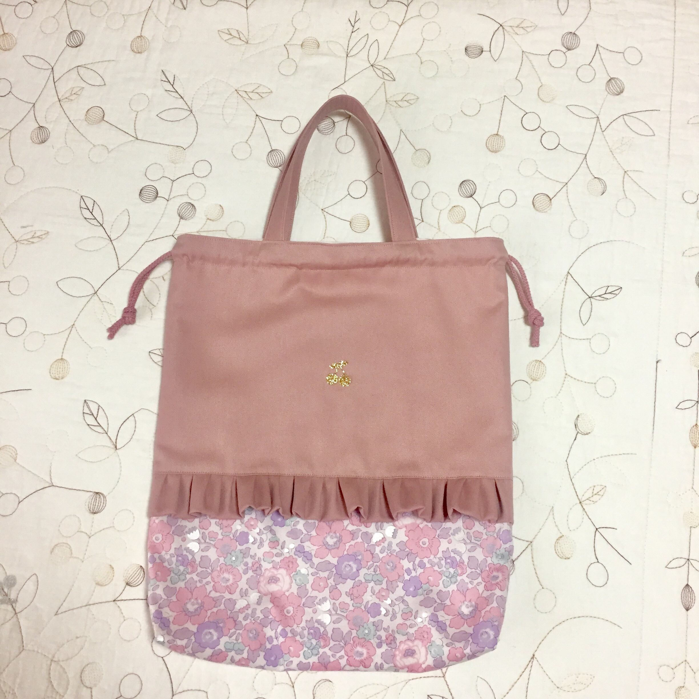 リバティ ベッツィ ユニコーン シルバーラメ(カーサノンナ)とツイル ピンクラベンダーで持ち手付き巾着袋を作製しました。