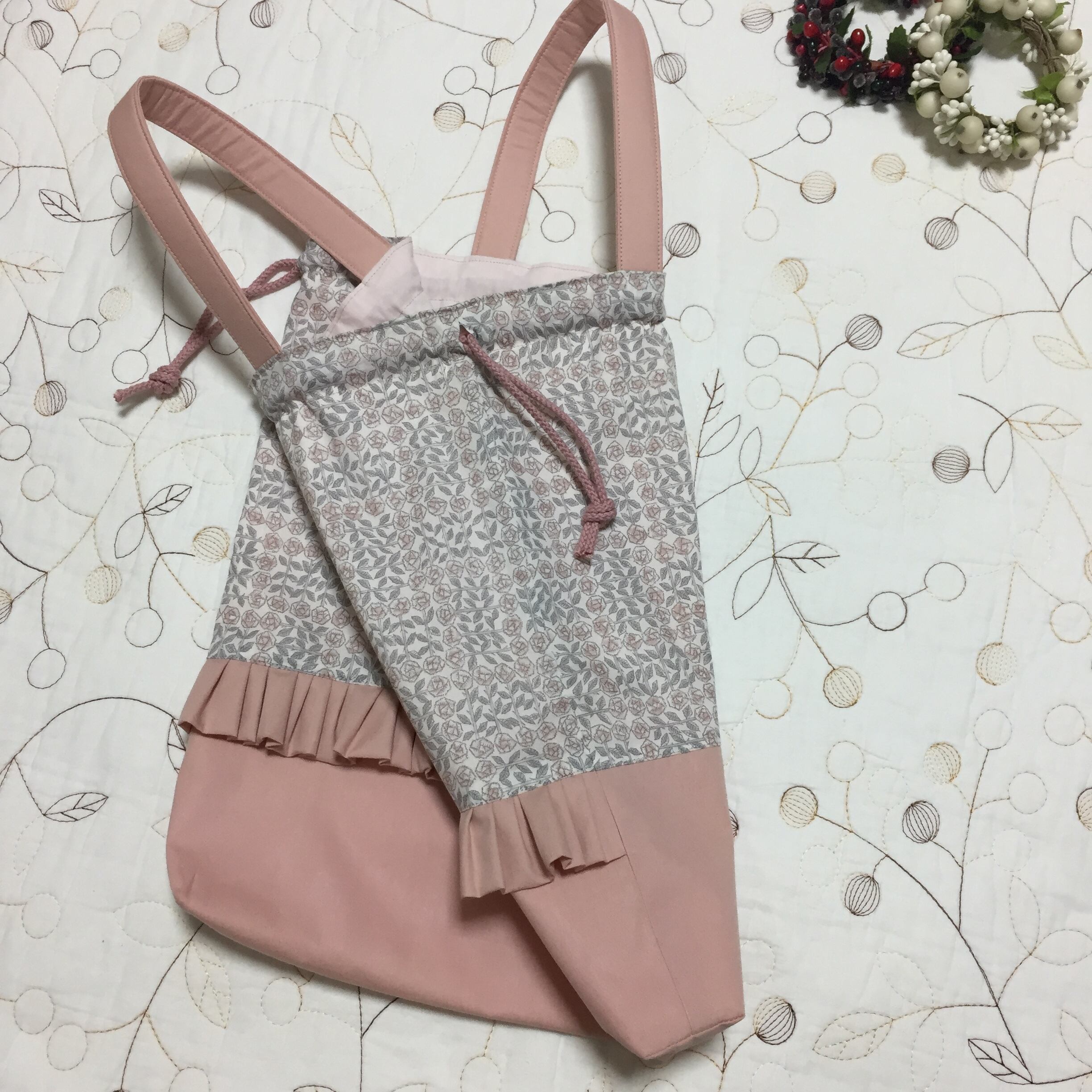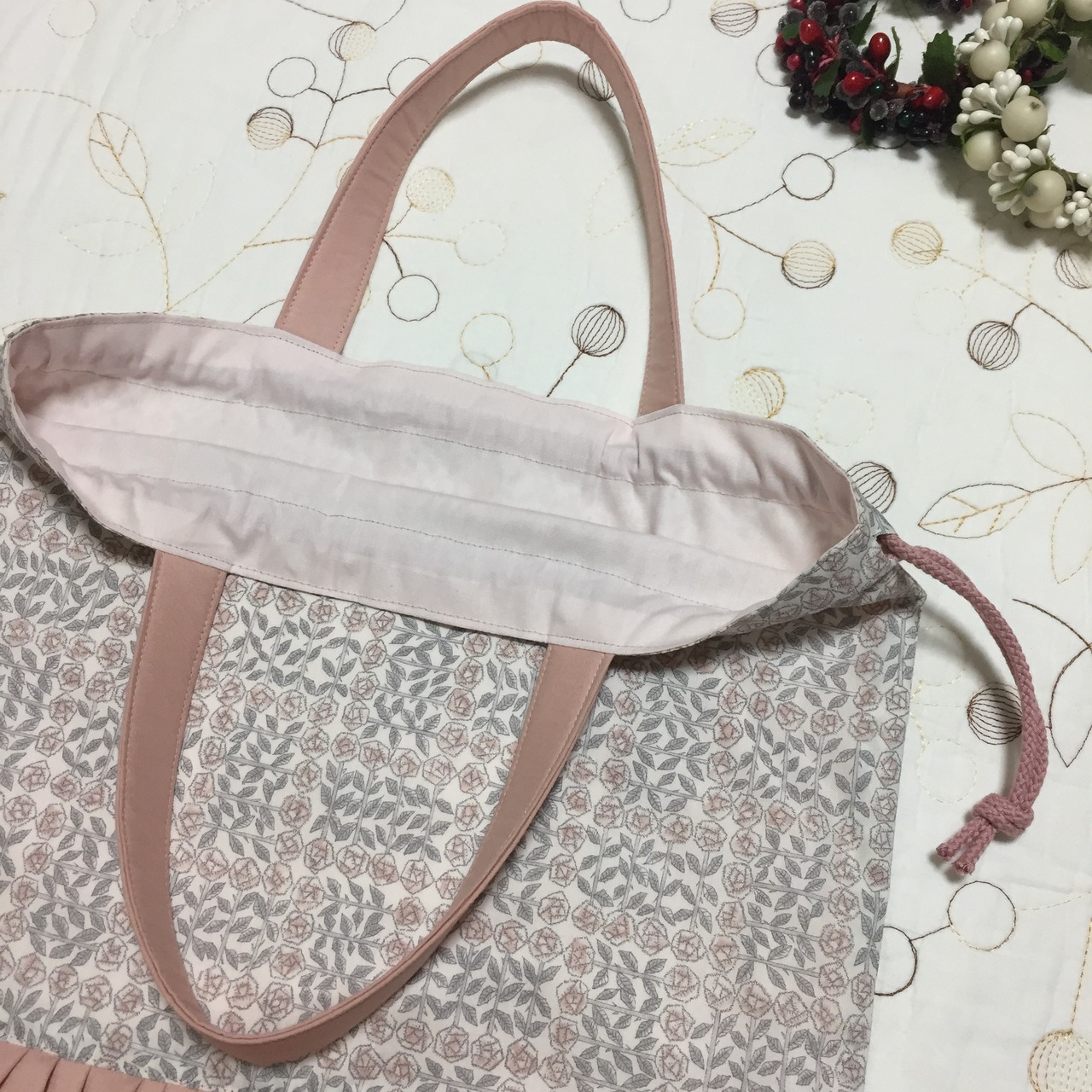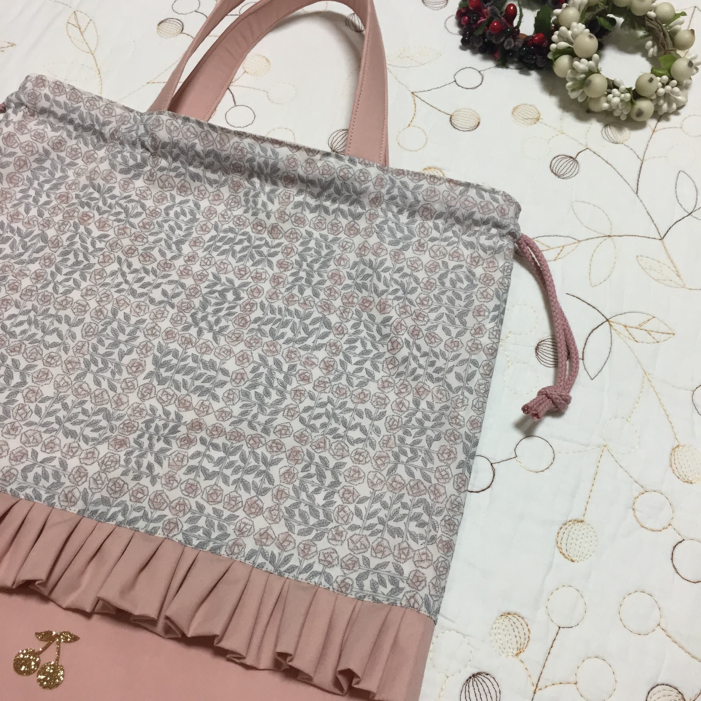 リバティ タナローン スリーピングローズ(メルシー)と海のブロードストロベリークリーム(チェックアンドストライプ)で持ち手付き巾着袋を作製しました