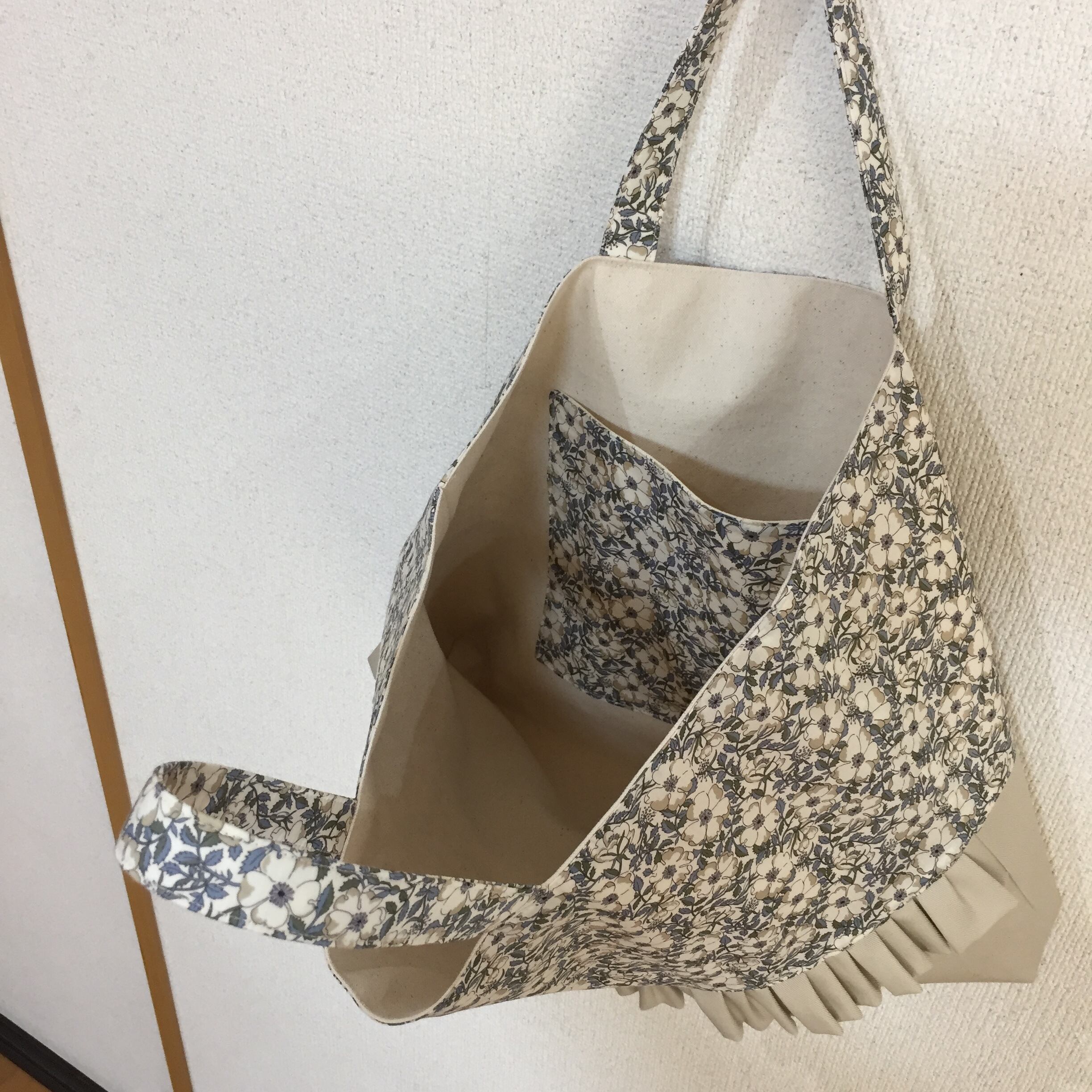 リバティ タナローン メイモリス ブルーグレーとツイル サンドベージュでレッスンバッグを作製しました。