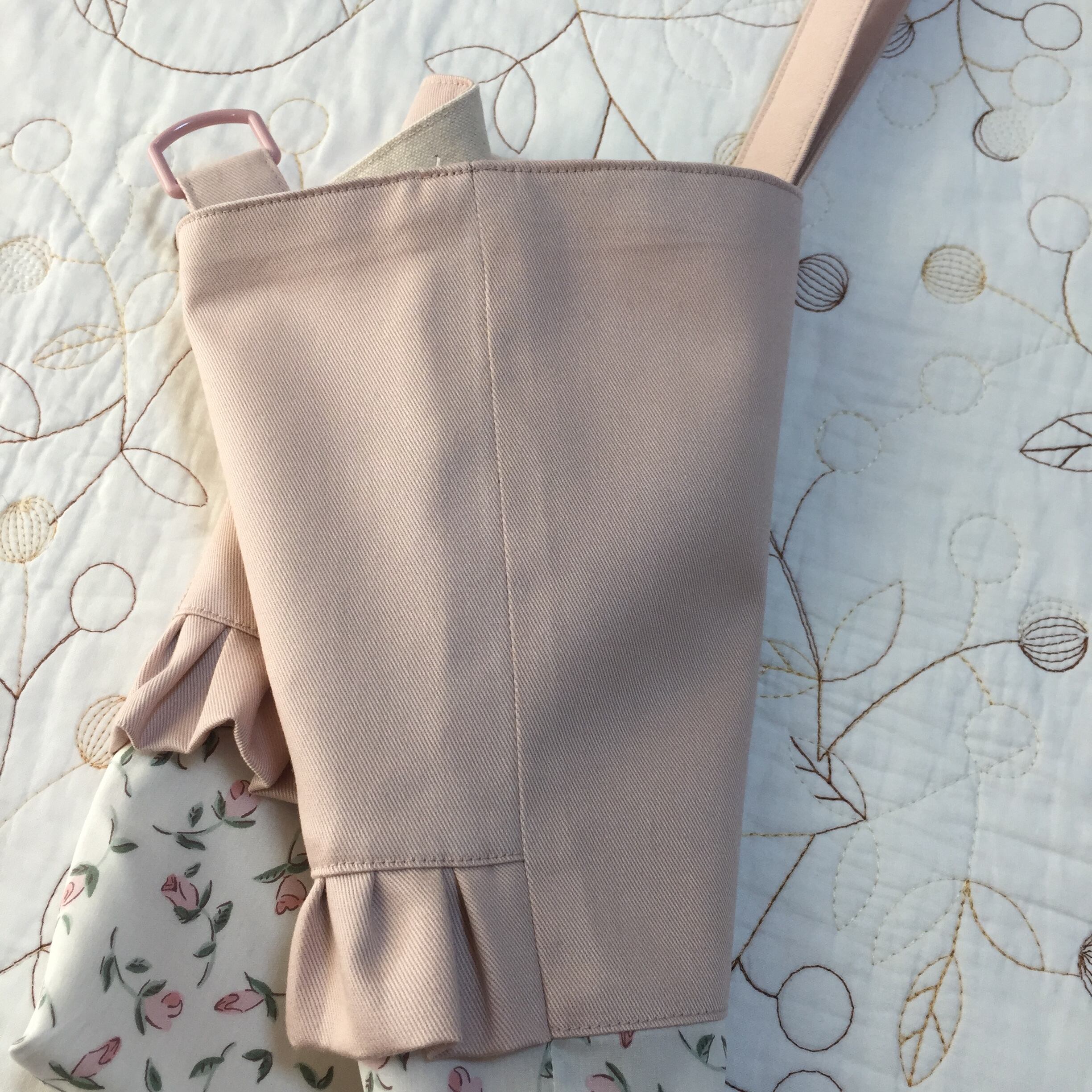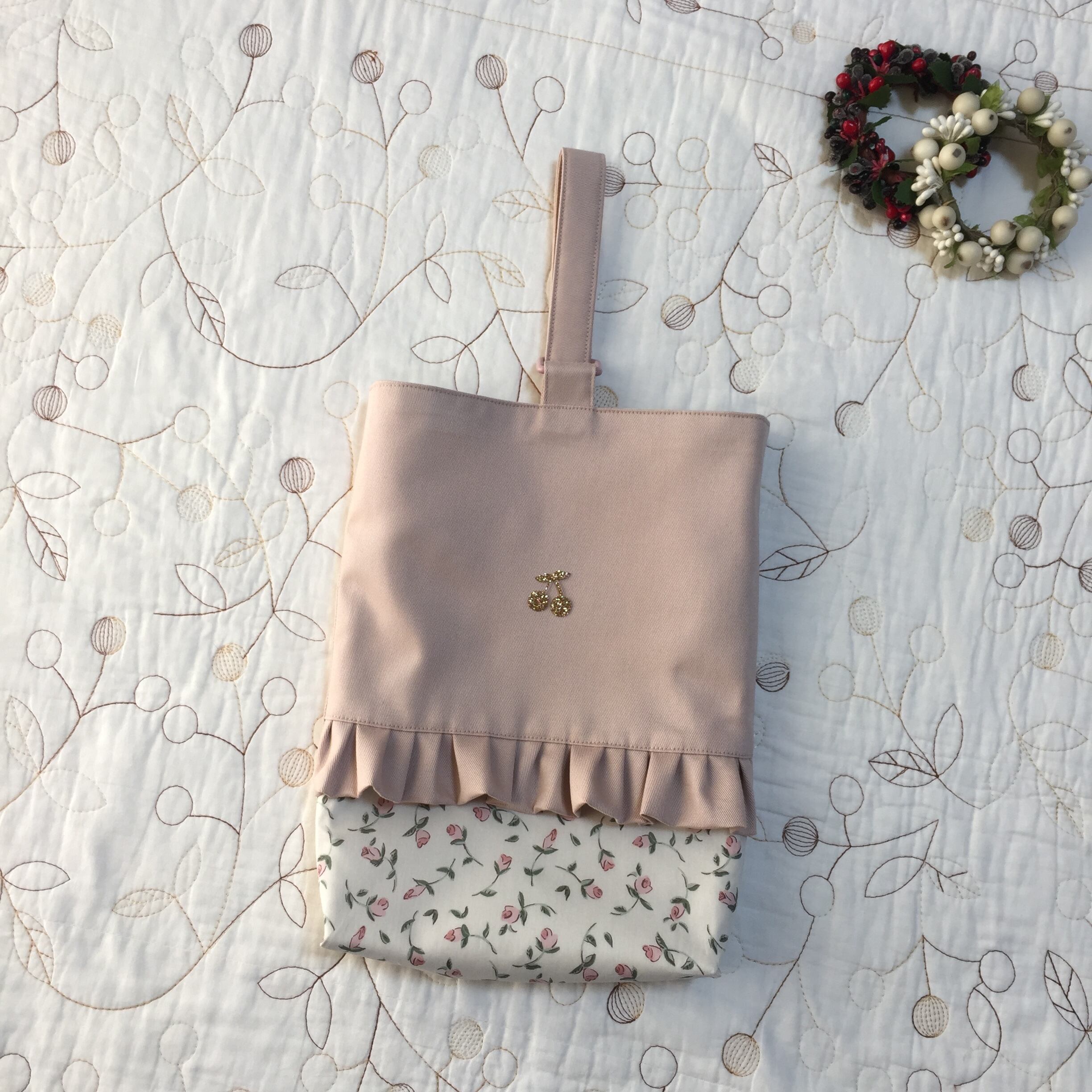 リバティ タナローン フローティングフローラ ピンク(チェックアンドストライプ)とツイルくすみのピンクで上靴入れを作製しました。