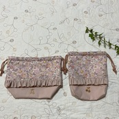 リバティ タナローン ベッツィ ゾゾモーイ メタリック(ラメ入り)と海のブロード グレイッシュピンク(チェックアンドストライプ )で片面フリル付きお弁当袋とコップ袋を作製しました。
