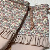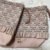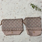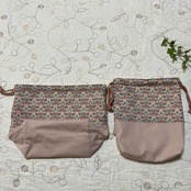 リバティ タナローン ストロベリーフィースト ピンク (チェックアンドストライプ)と海のブロード グレイッシュピンク(c&s)で片面フリル付きお弁当袋とコップ袋を作製しました。