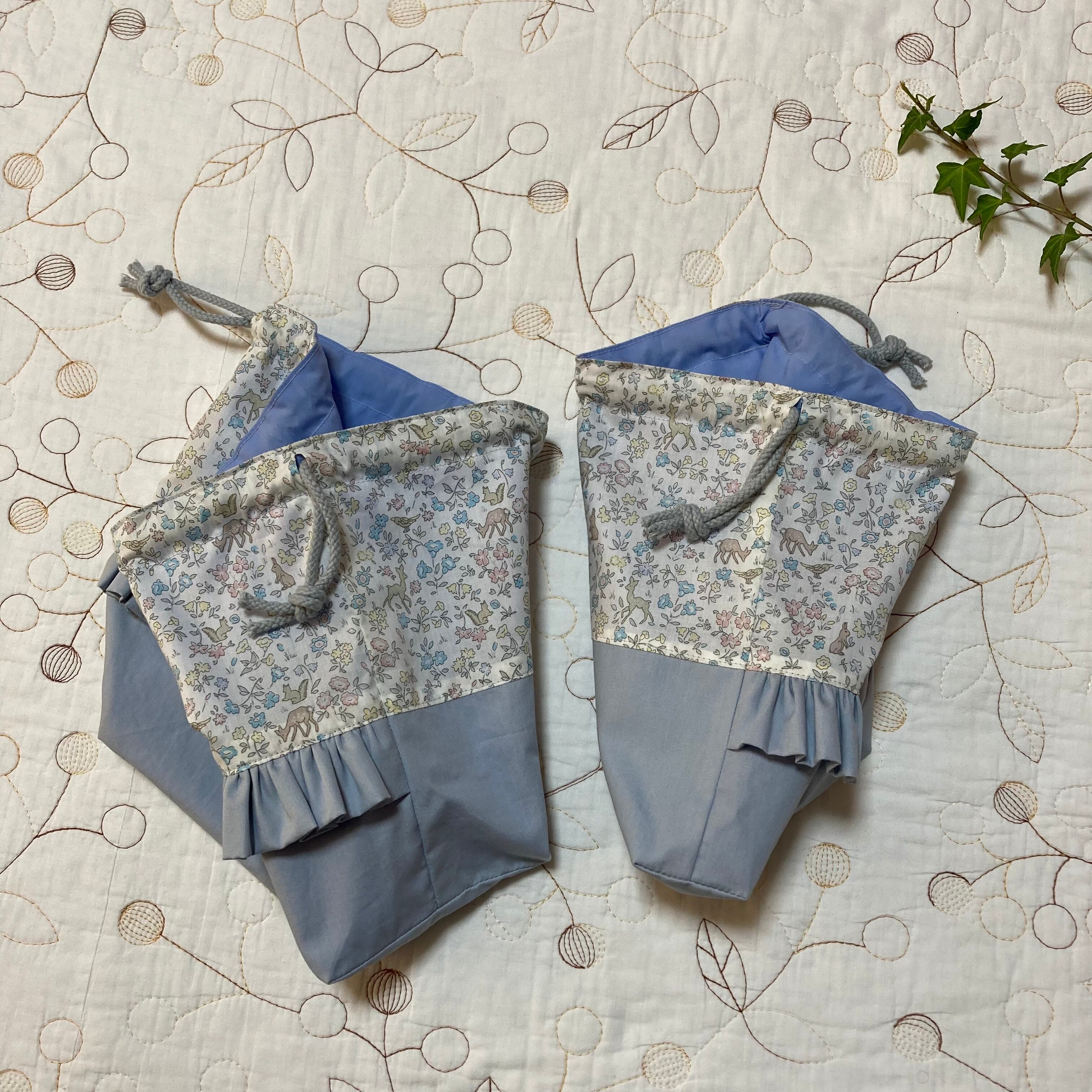 リバティ タナローン メドウテイルズ パステルカラー(チェックアンドストライプ)と海のブロード ライトブルーグレー(c&s)で片面フリル付きお弁当袋とコップ袋を作製しました。