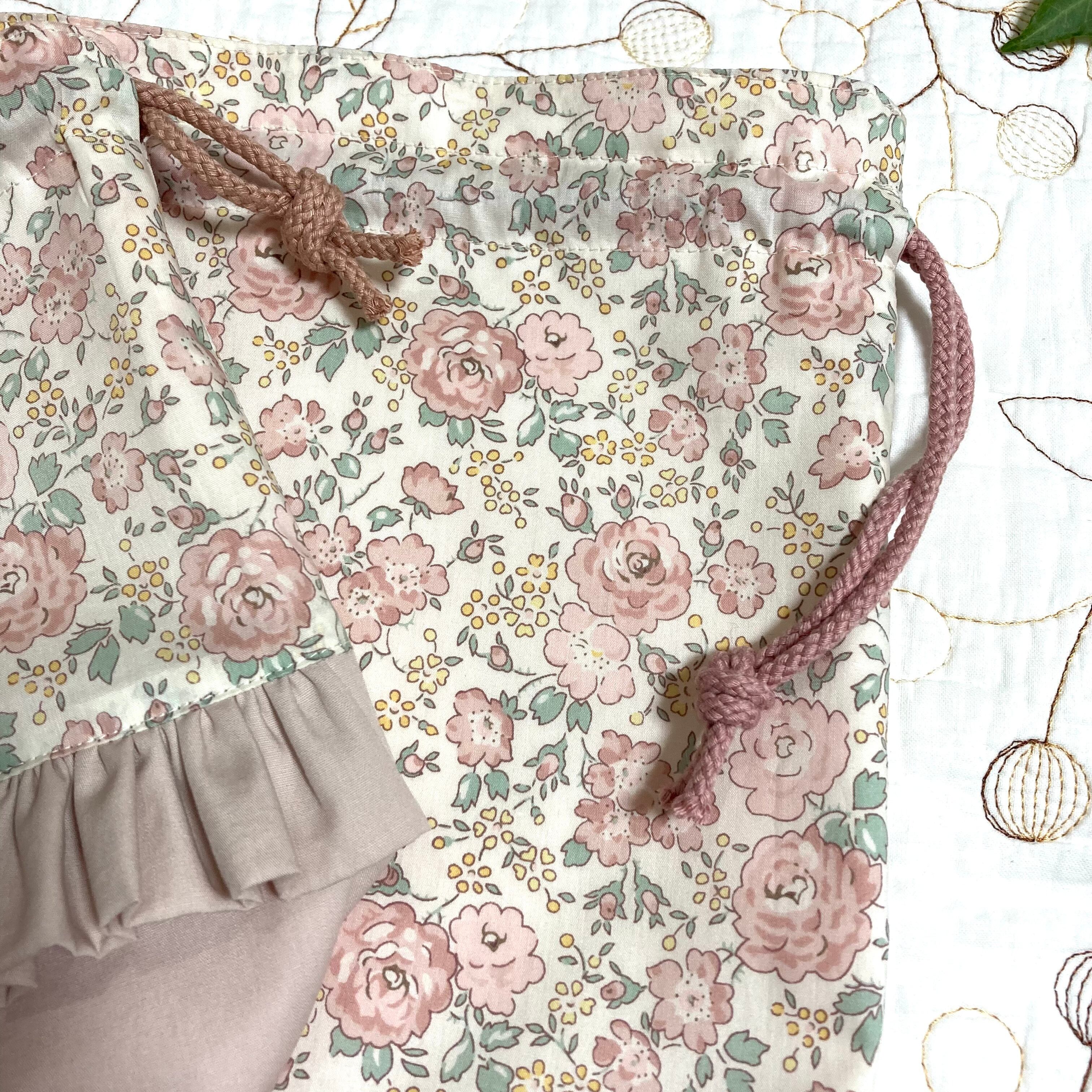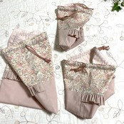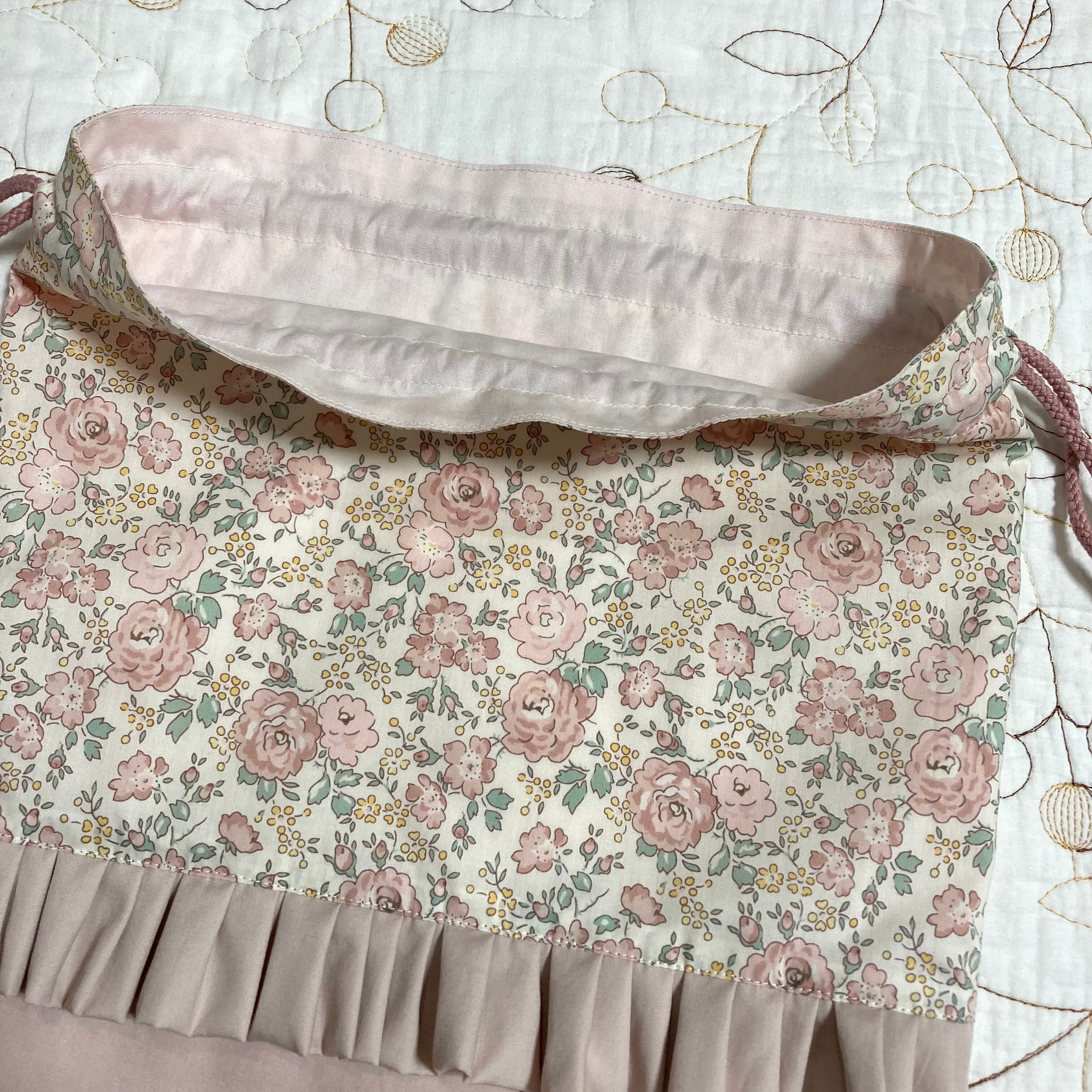 リバティ タナローン フェリシテ ダウンシャーヒル (カーサノンナ)と海のブロード グレイッシュピンク(チェック&ストライプ )で片面フリル付きの巾着袋とお弁当袋、コップ袋を作製しました。