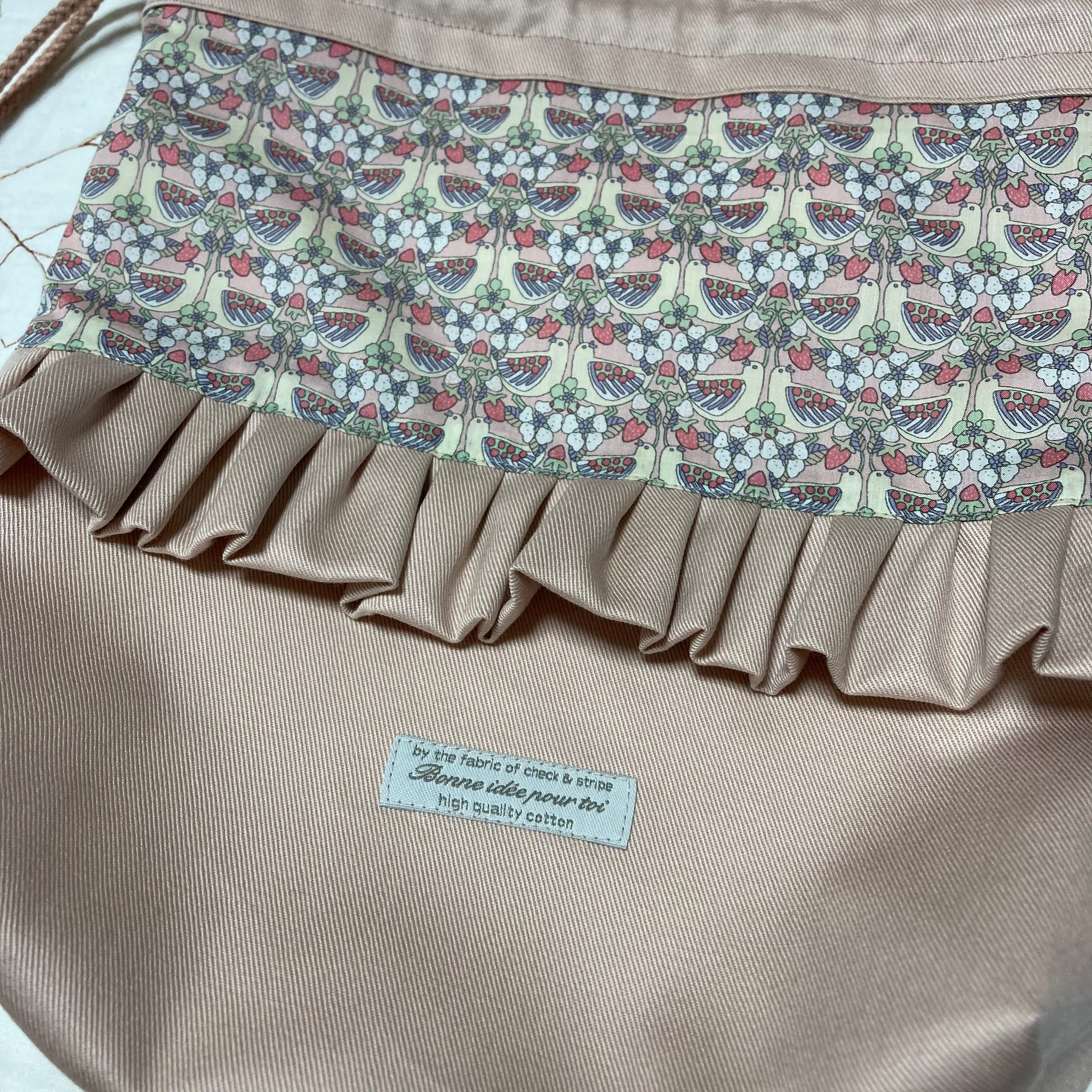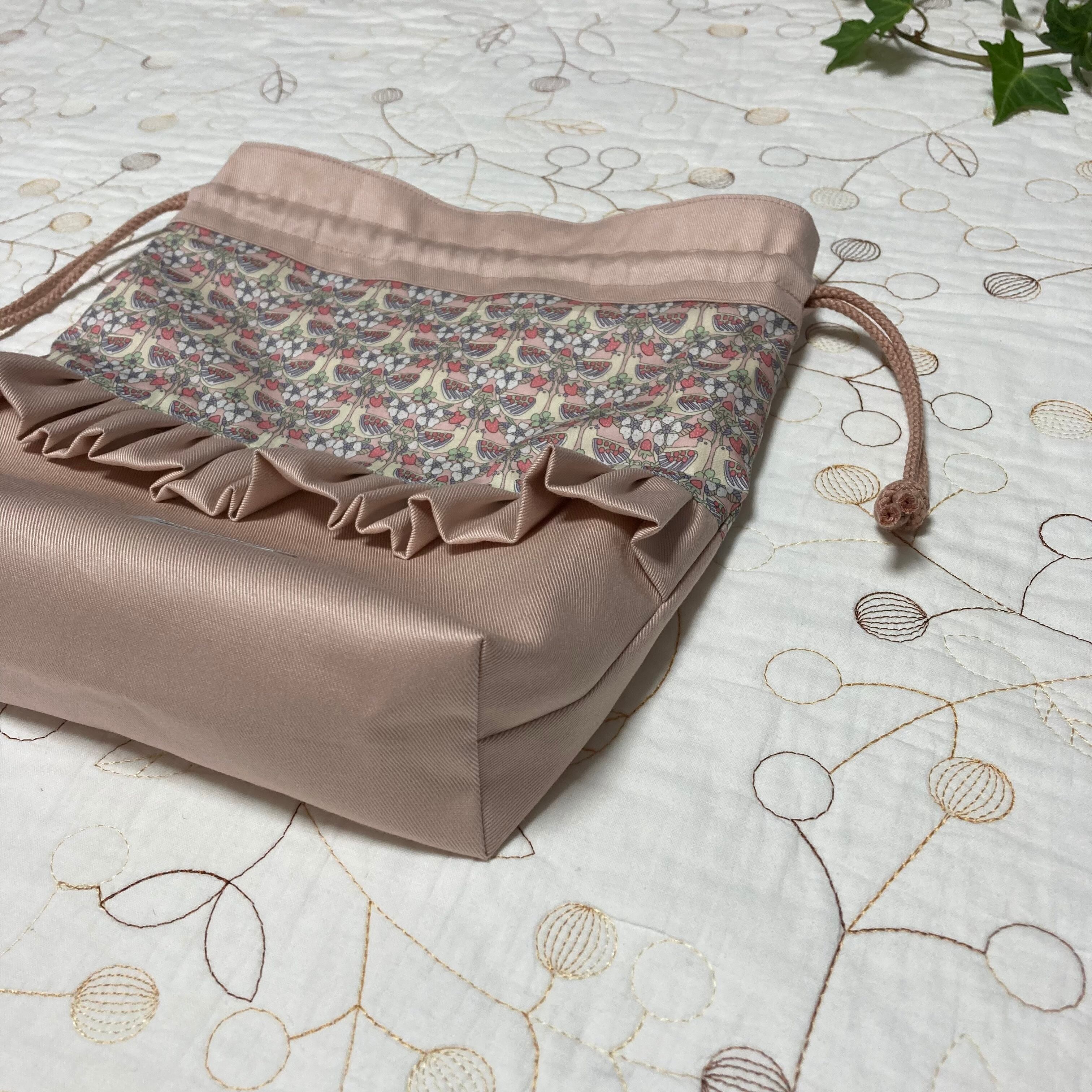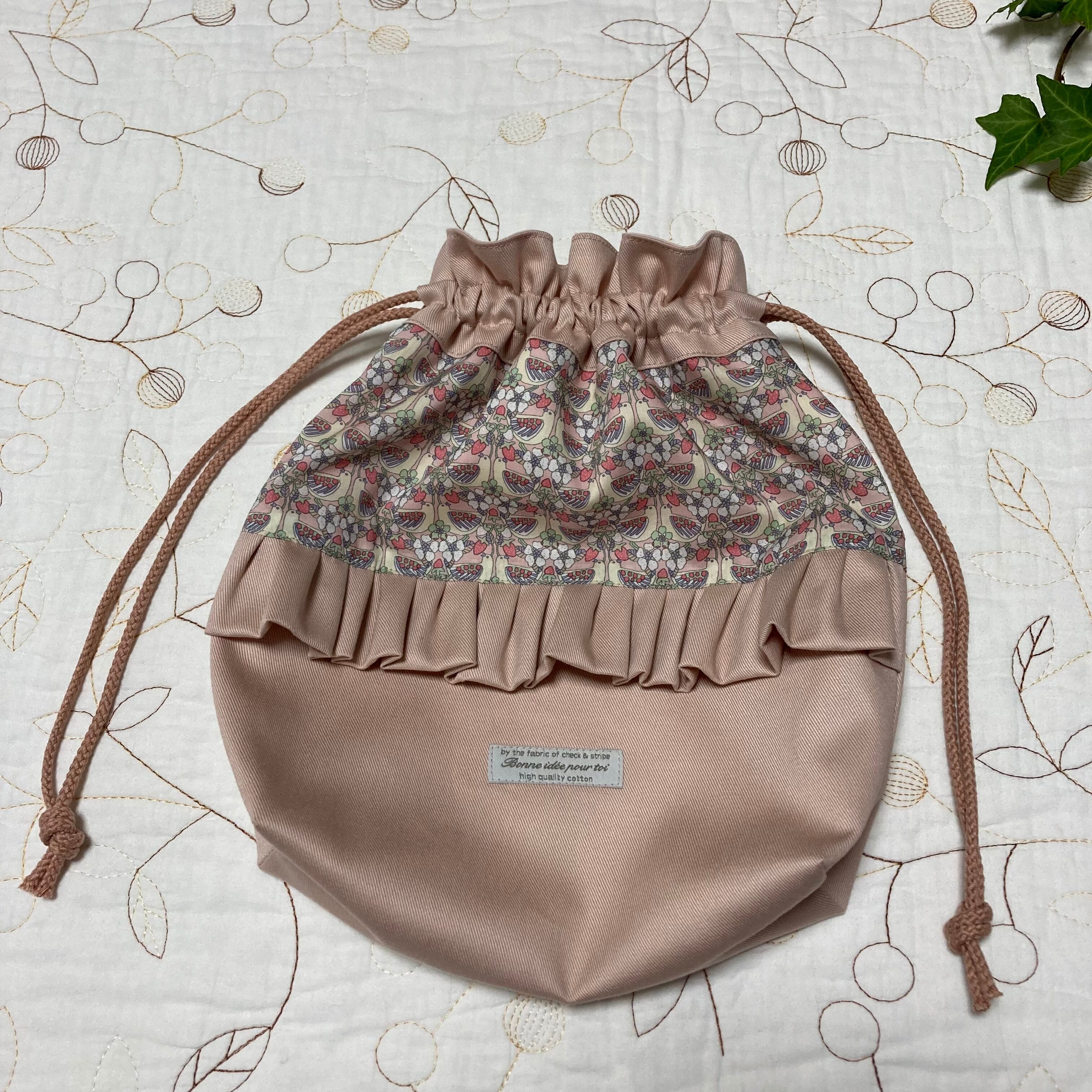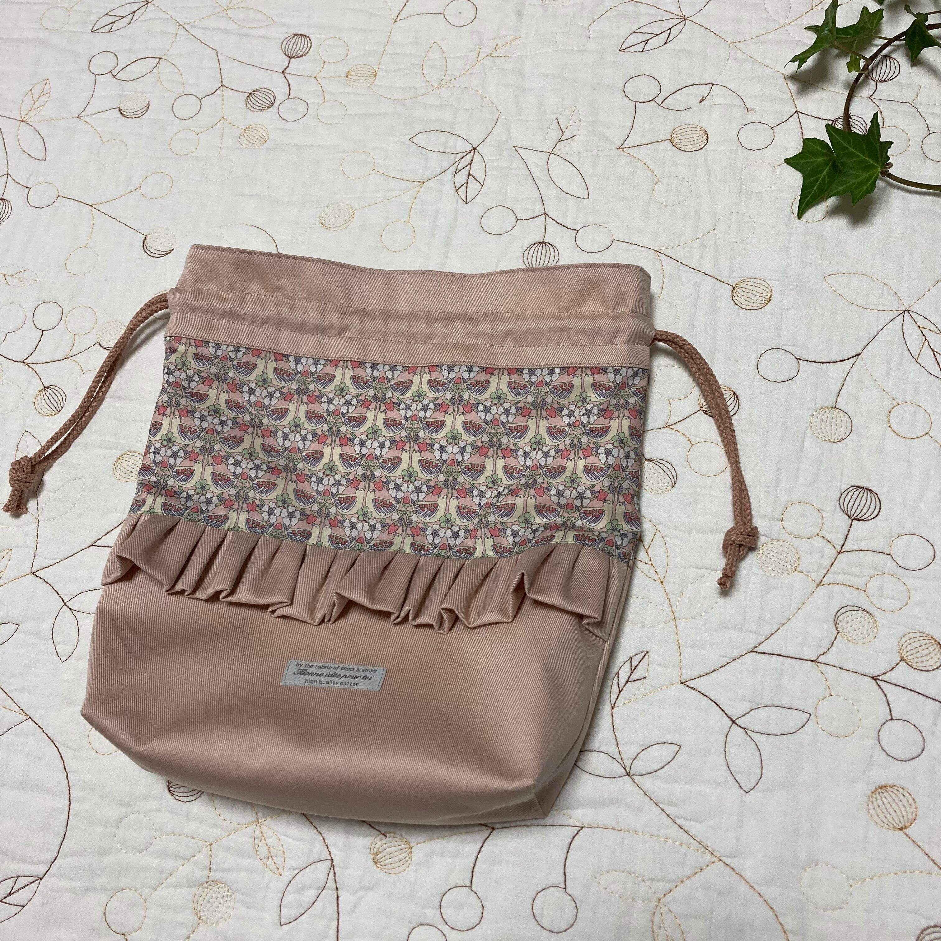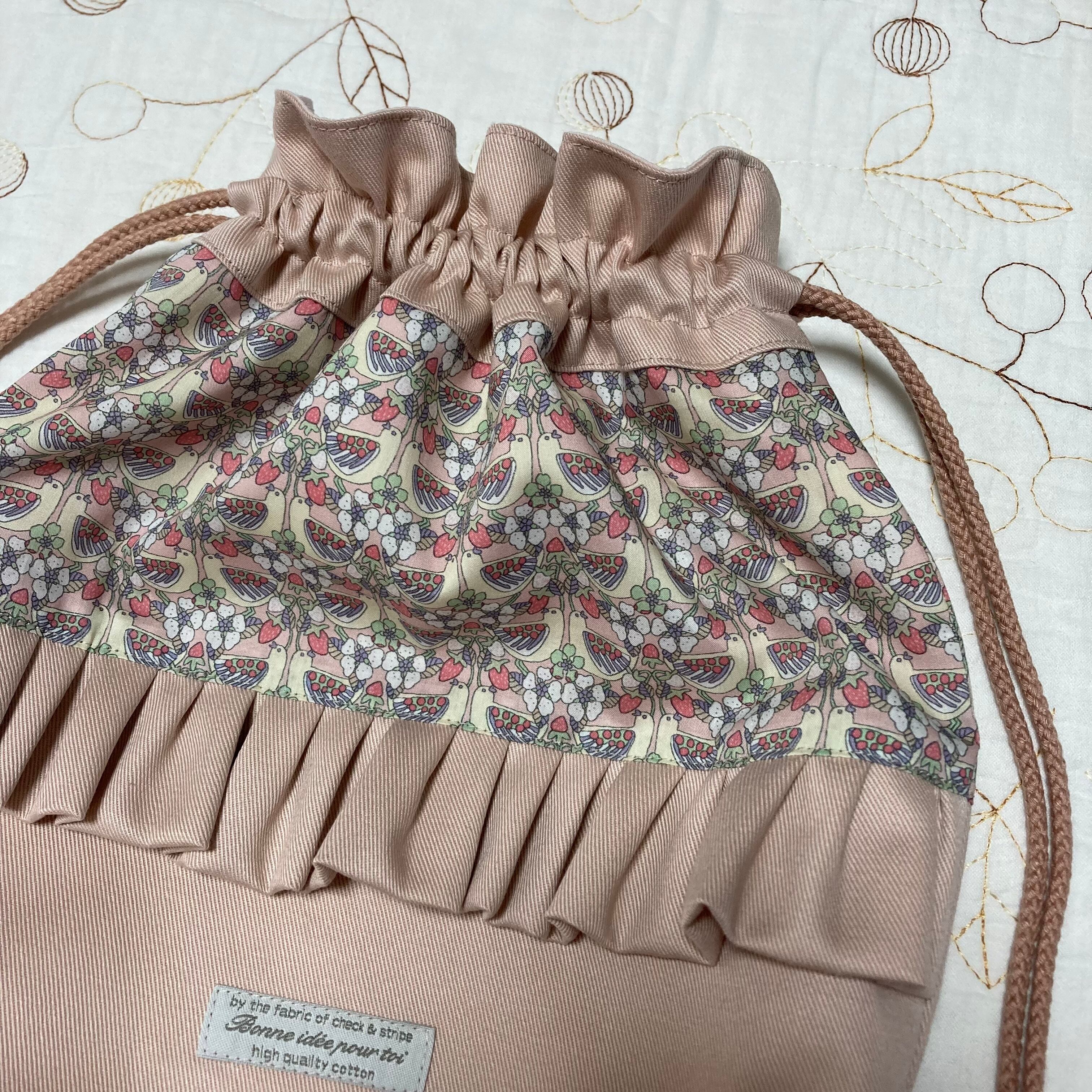 リバティ タナローン ストロベリーフィースト ピンク(チェックアンドストライプ )とツイルくすみのピンクで巾着袋を作製しました。