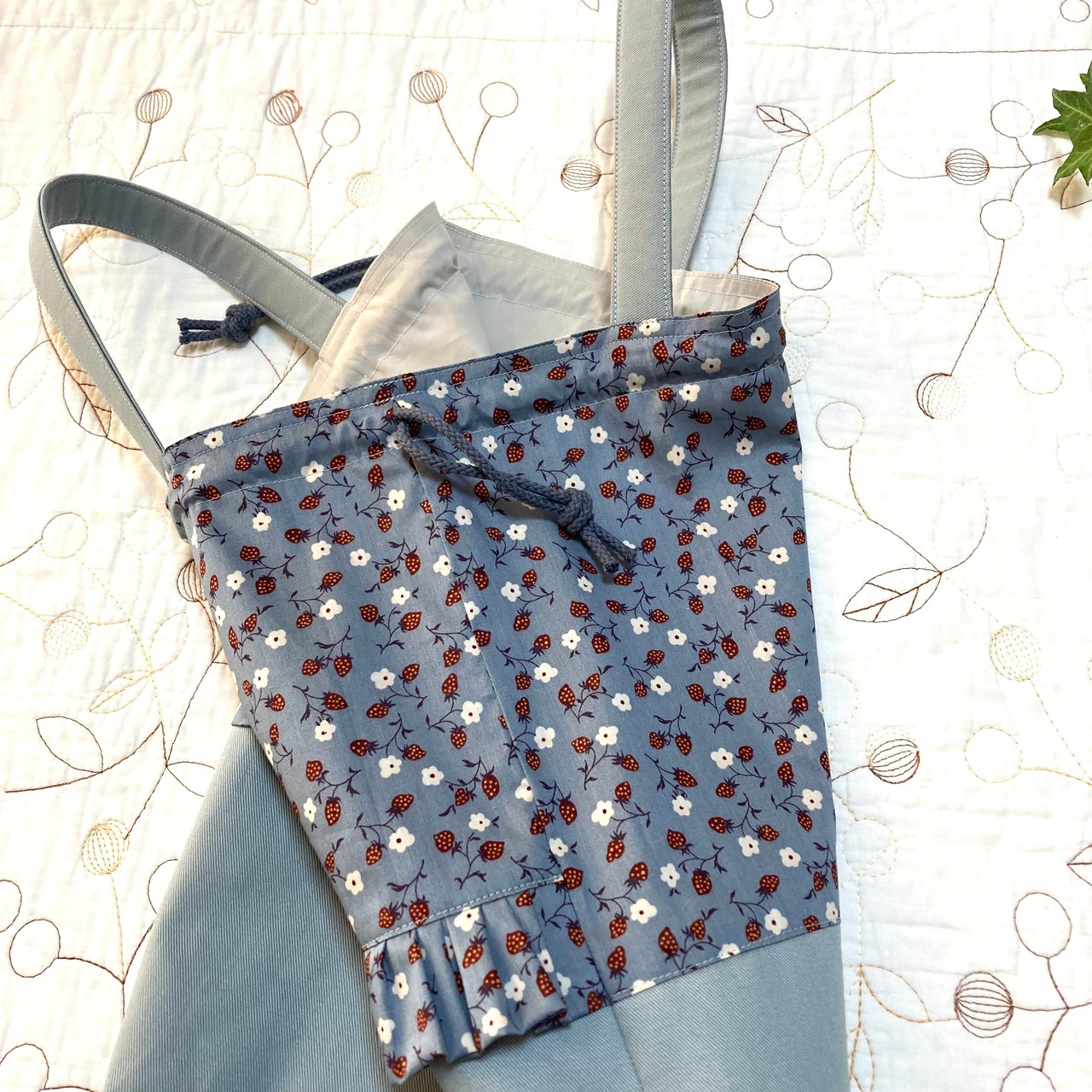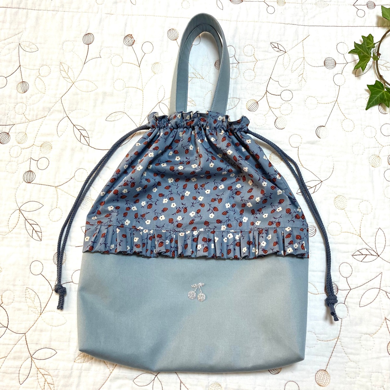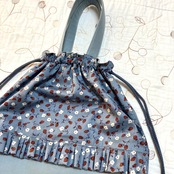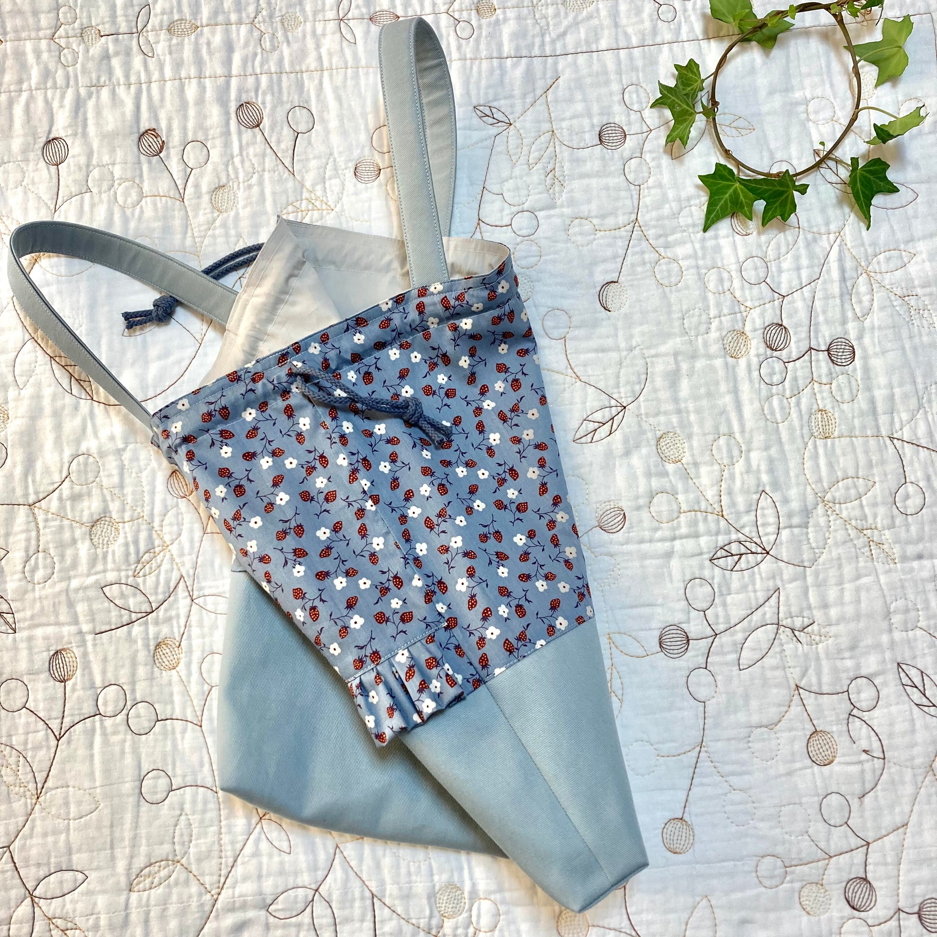 リバティ タナローン イザベル ブルーとツイル ブルーグレーで持ち手付き巾着袋を作製しました。