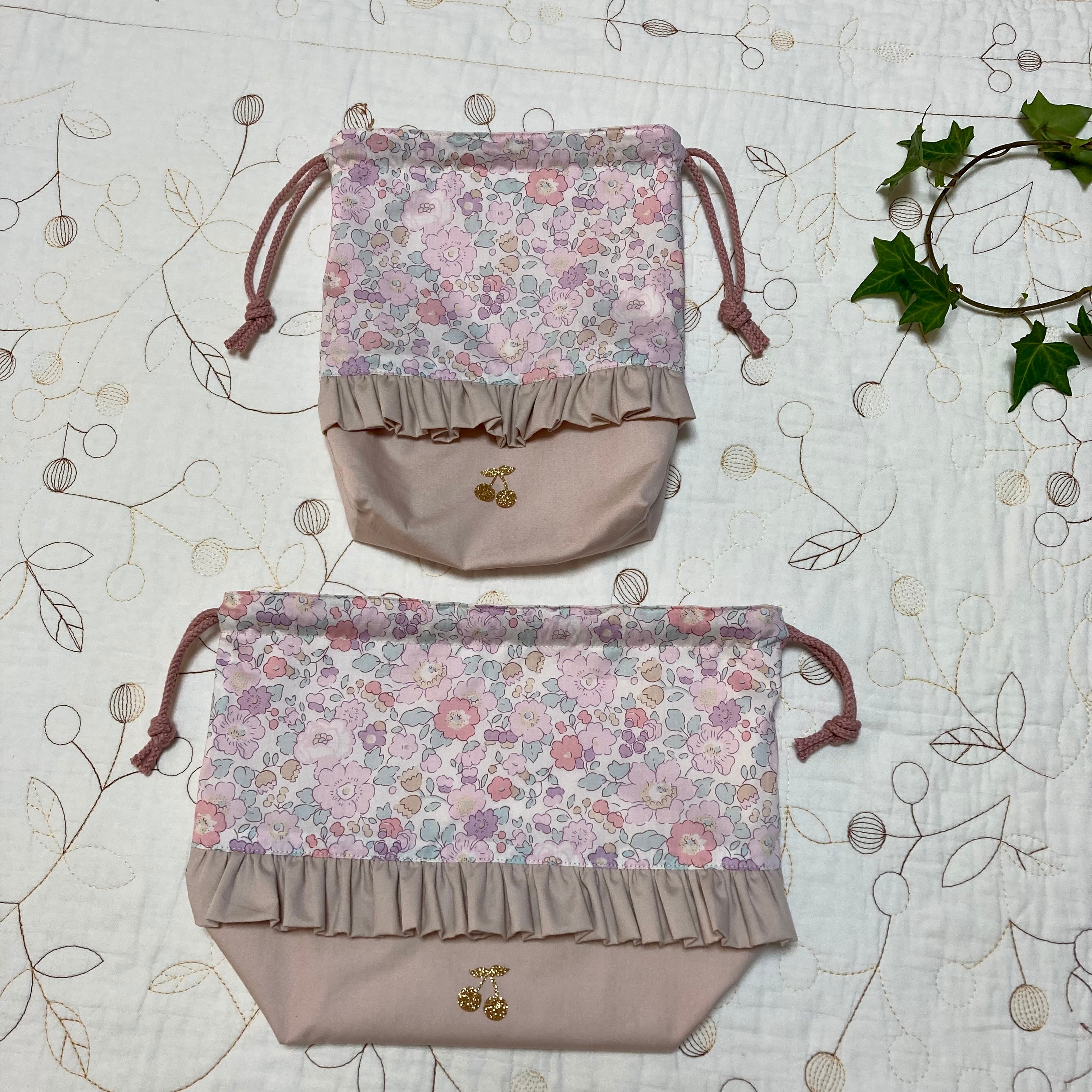 リバティ タナローン ベッツィ ピンクモーヴ (カーサノンナ)と海のブロード グレイッシュピンク(c&s)で片面フリル付きお弁当袋とコップ袋を作製しました。