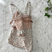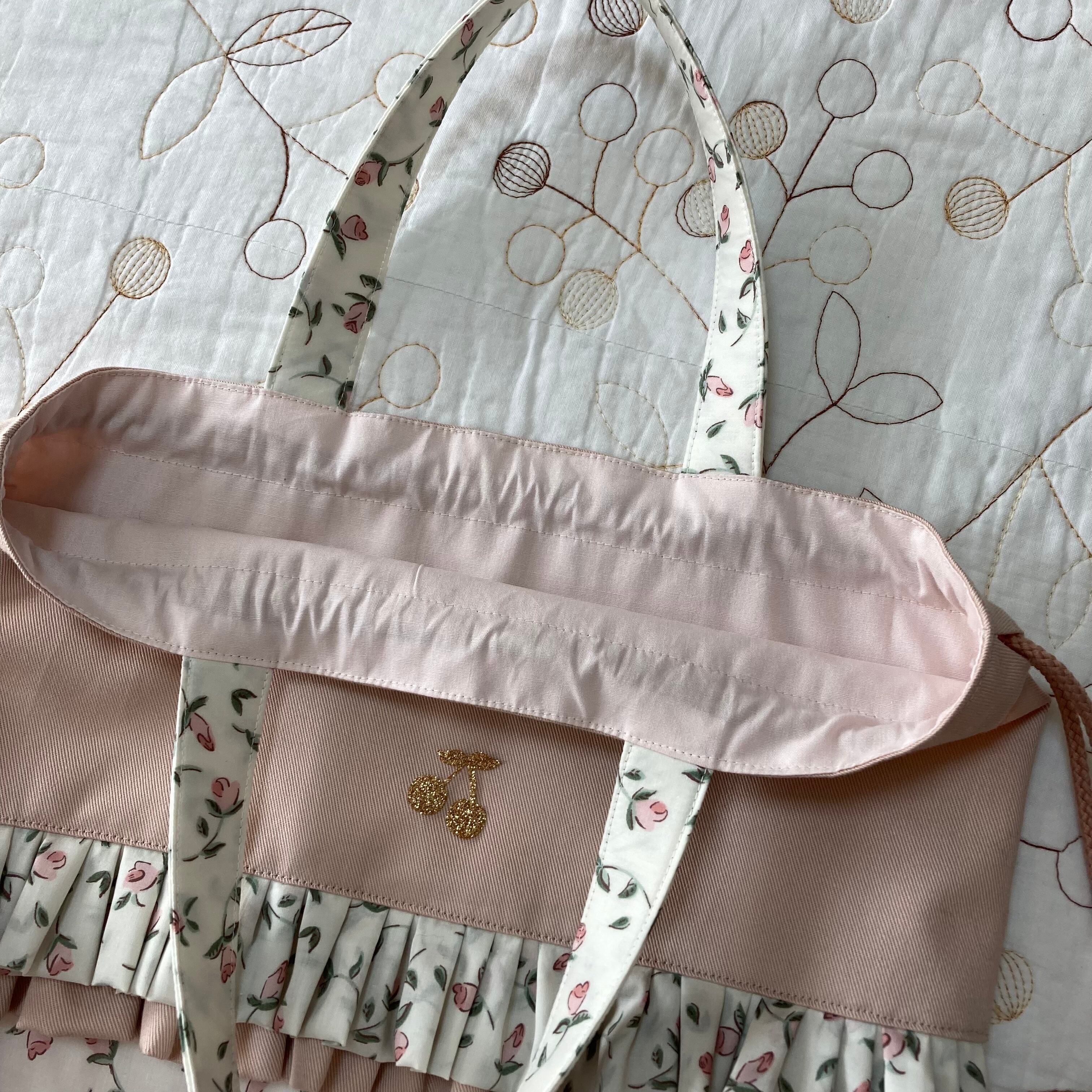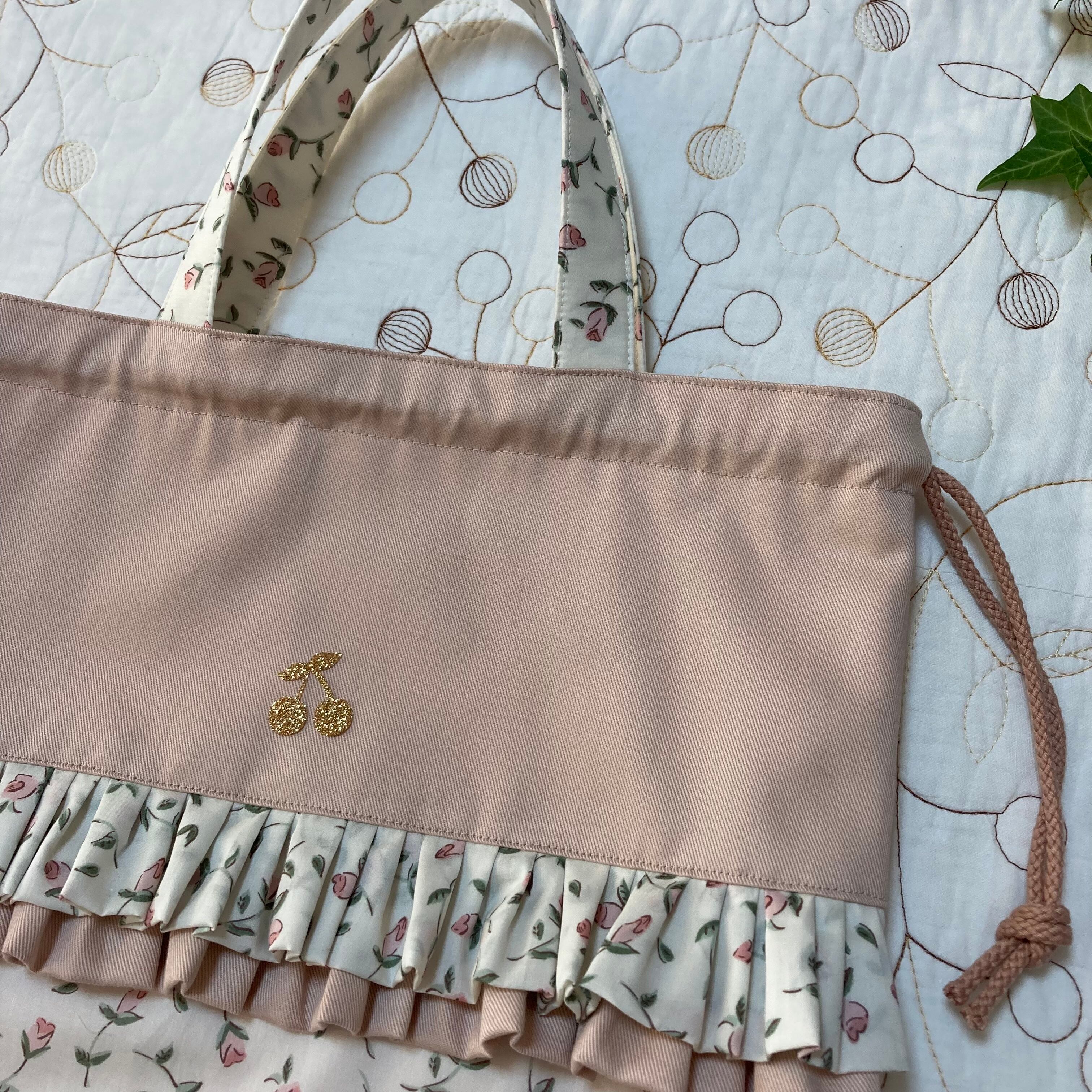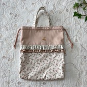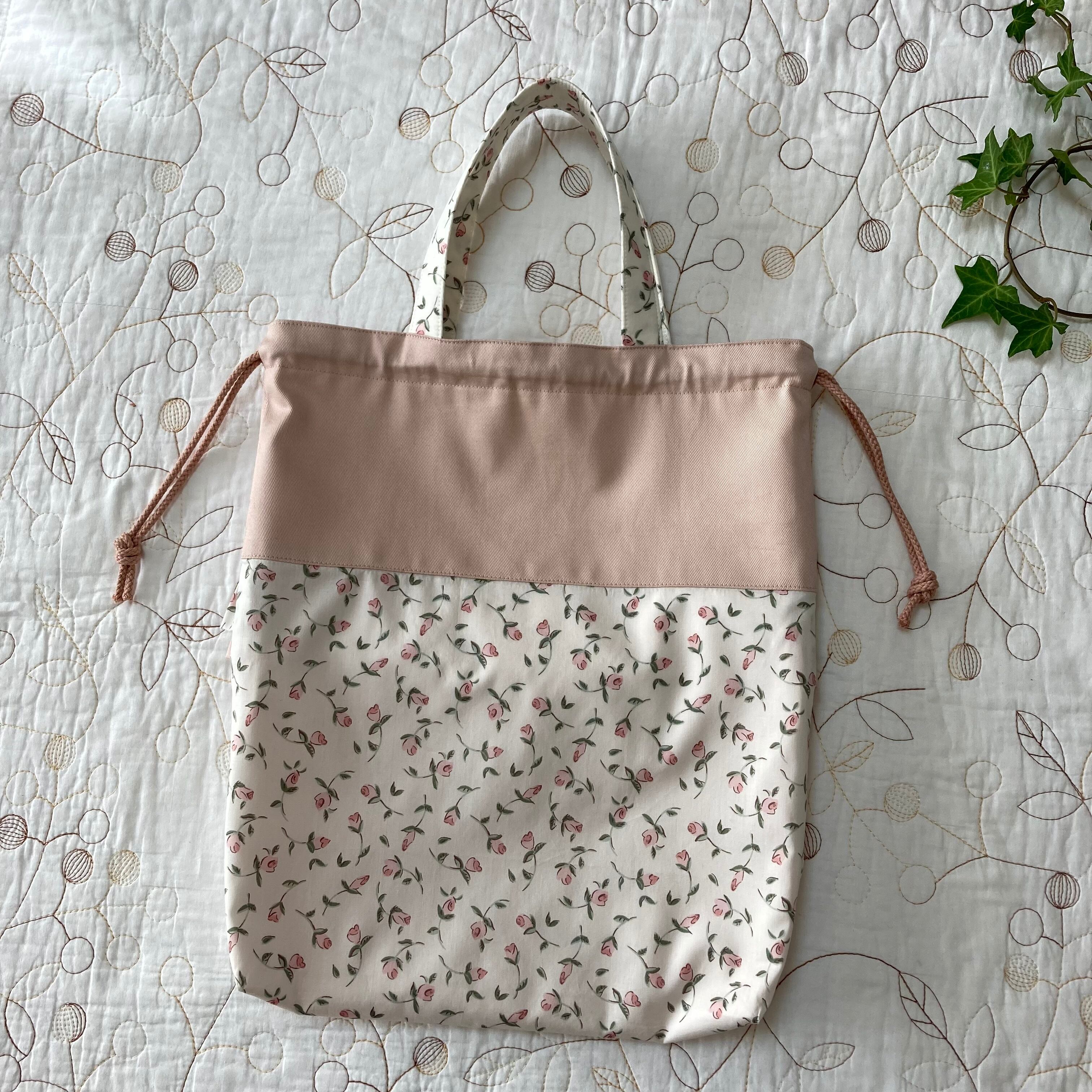 リバティ タナローン フローティングフローラ ピンク(チェックアンドストライプ )とツイル くすみのピンクで持ち手付き巾着袋を作製しました。