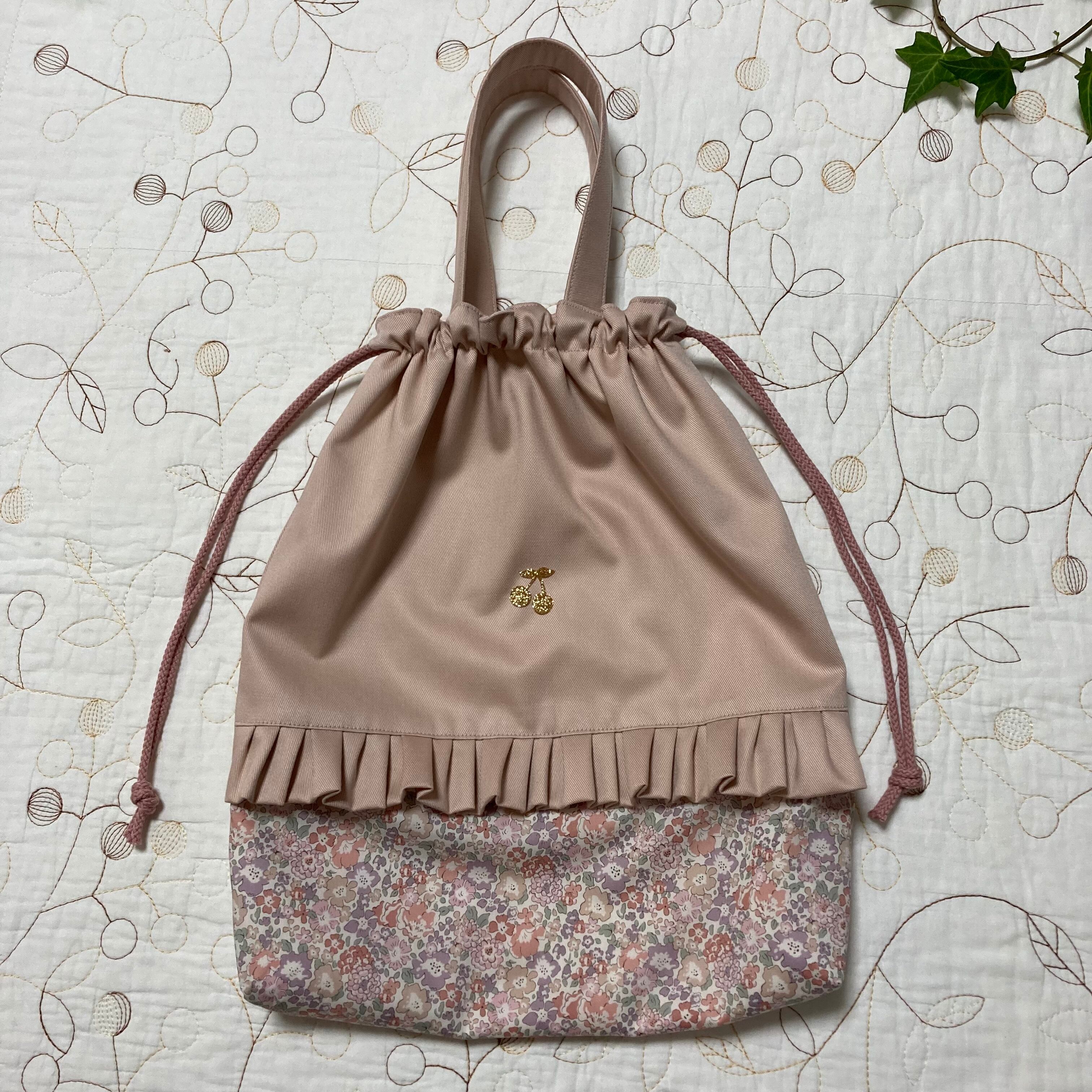 リバティ タナローン ミシェル パールベージュ(チビチビキッチン)とツイル くすみのピンクで巾着袋を、