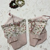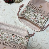 リバティ タナローン ジョセフィンズガーデン (チェックアンドストライプ)と海のブロード グレイッシュピンク(c&s)で片面フリル付きデザインのお弁当袋とコップ袋を作製しました。