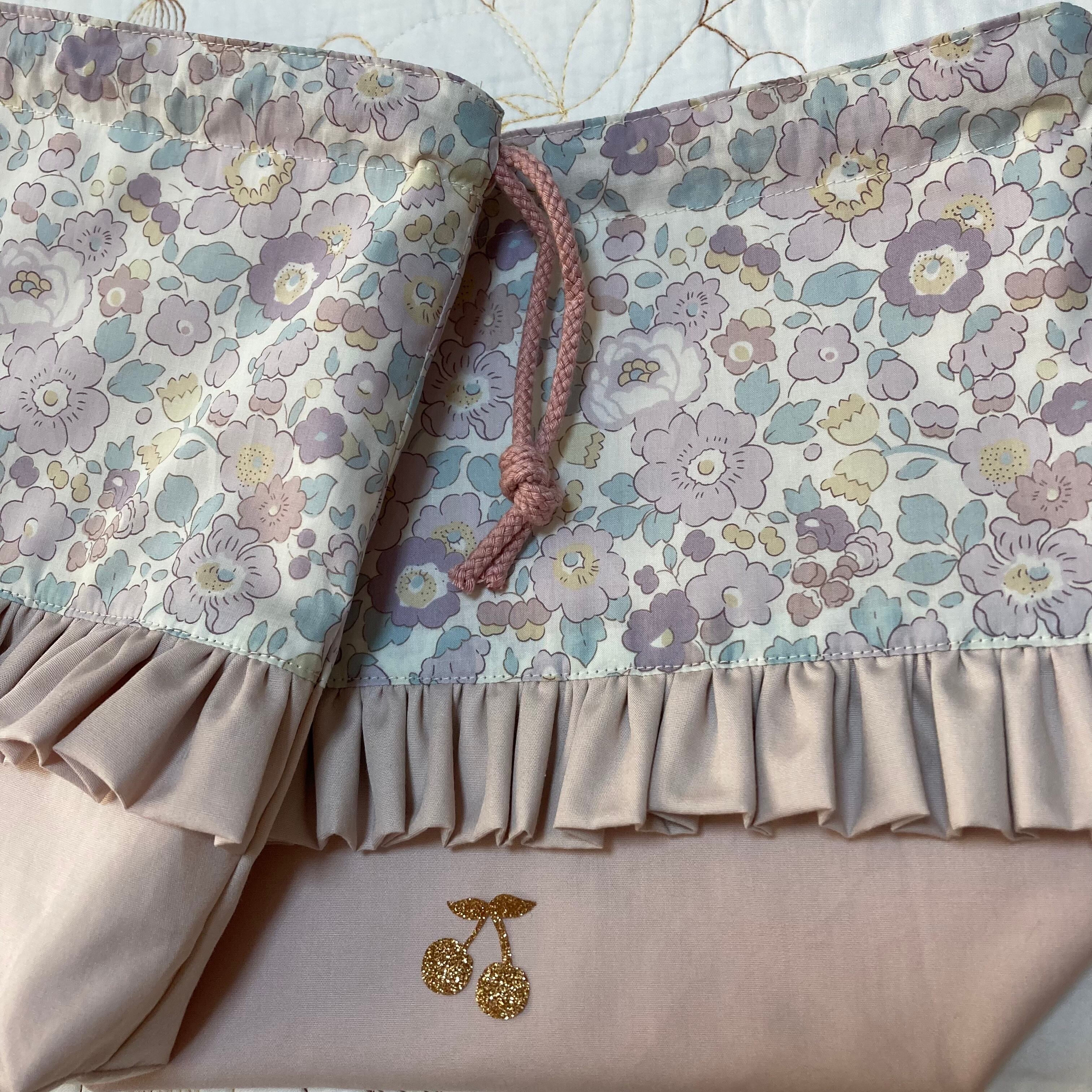 リバティ タナローン ベッツィ オールドラベンダー (チェックアンドストライプ)と海のブロード グレイッシュピンク(c&s)で片面フリル付きデザインのお弁当袋とコップ袋を作製しました。
