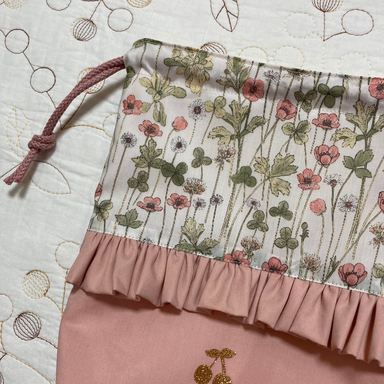 リバティ タナローン ジョセフィンズガーデン(チェックアンドストライプ )と海のブロード ストロベリークリーム(チェックアンドストライプ)で巾着袋を作製しました。