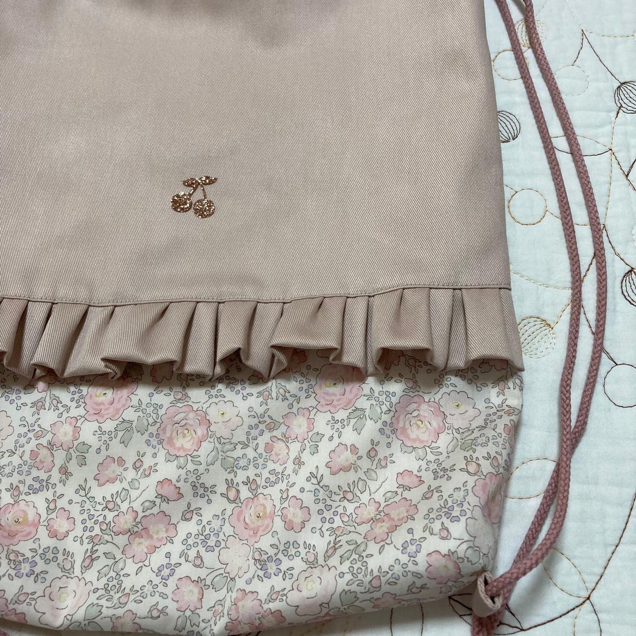 *リバティ タナローン フェリシテ ペールピンク(チェックアンドストライプ)とツイルくすみのピンクでナップサックを作製しました。