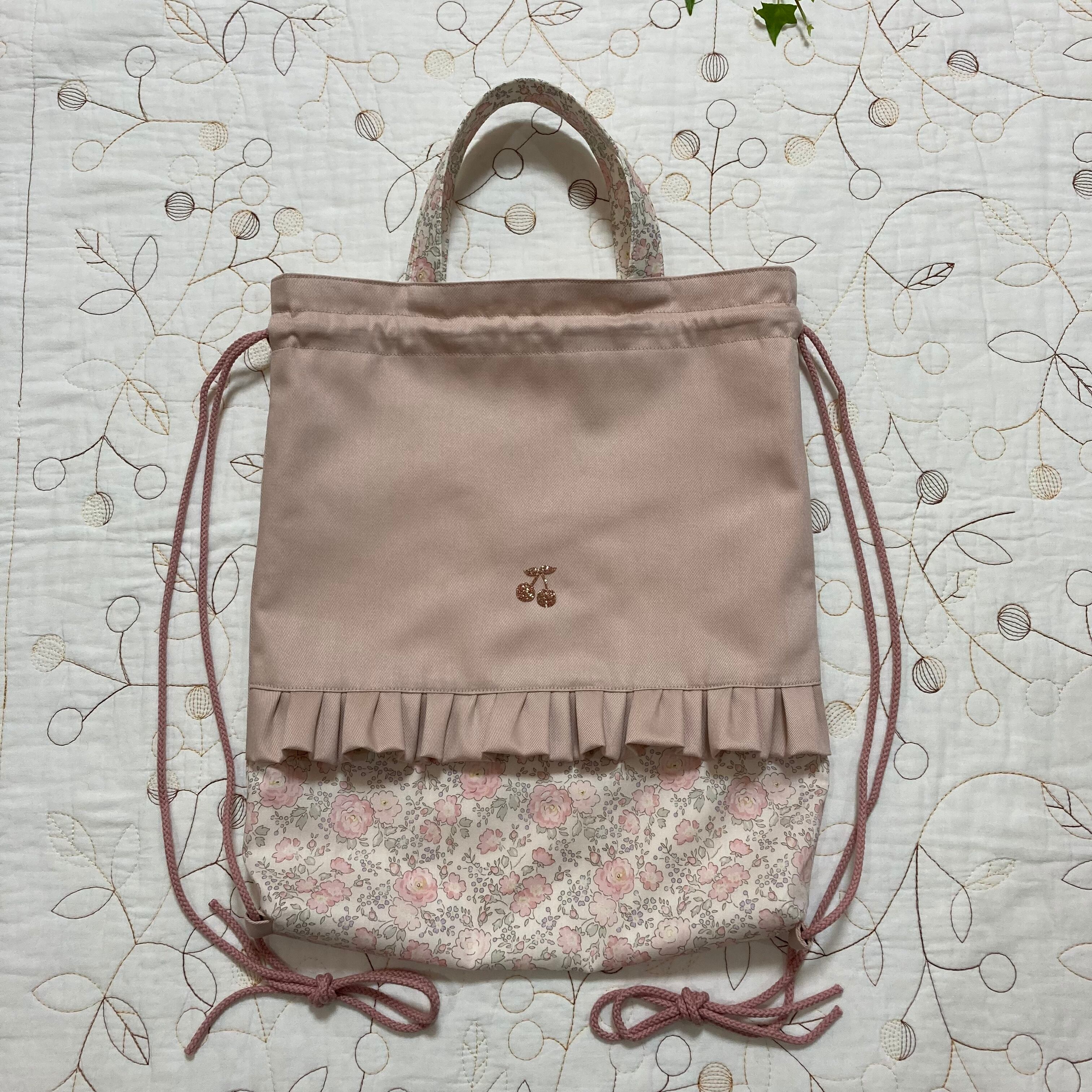 ナップサック ハンドメイド お着替え袋 体操着袋 リバティ フェリシテ ペールピンク チェックアンドストライプ