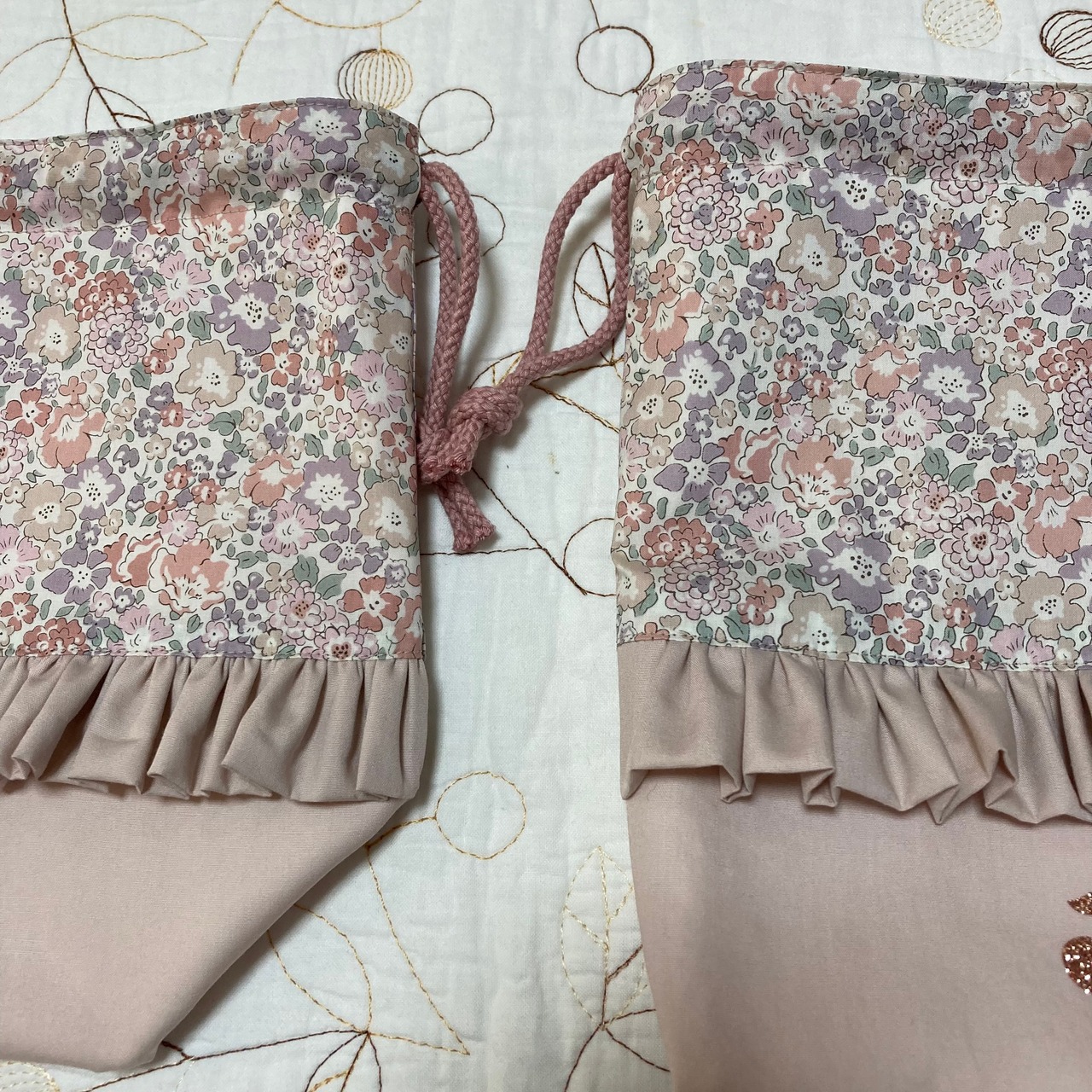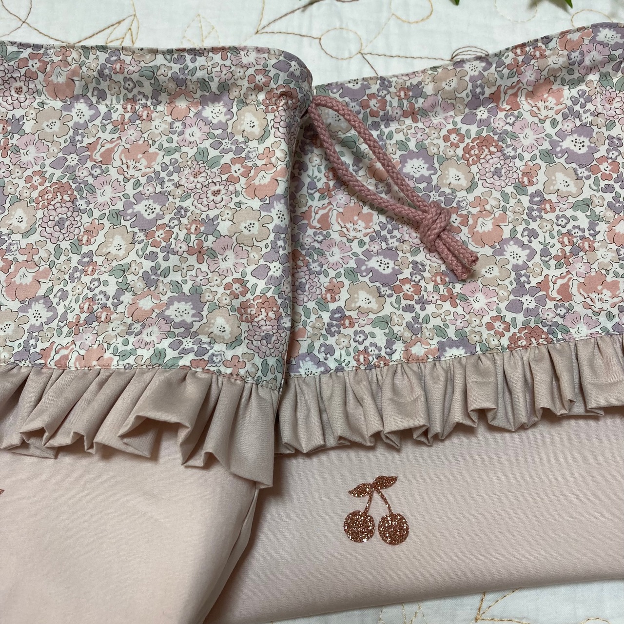 リバティ タナローン ミシェル パールベージュと海のブロード グレィッシュピンク(c&s)で片面フリル付きデザインのお弁当袋とコップ袋を作製しました。