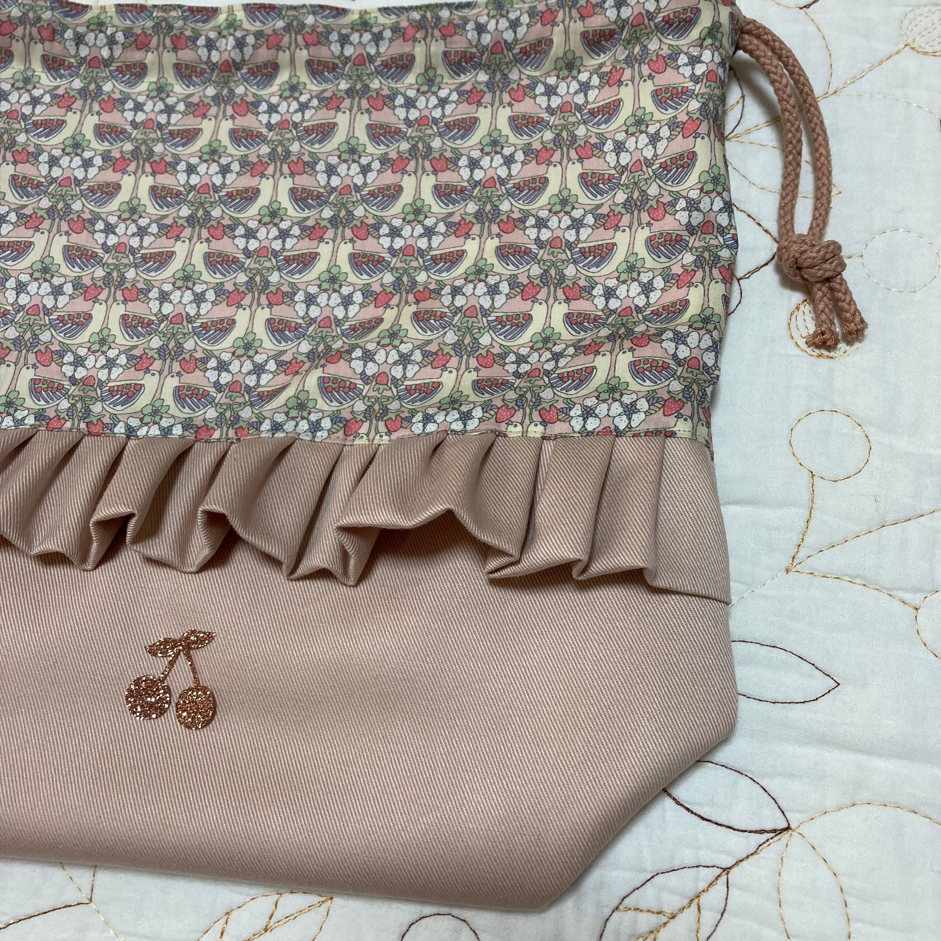 リバティ タナローン ストロベリーフィースト ピンク (チェックアンドストライプ )とツイル くすみのピンクで巾着袋を作製しました。