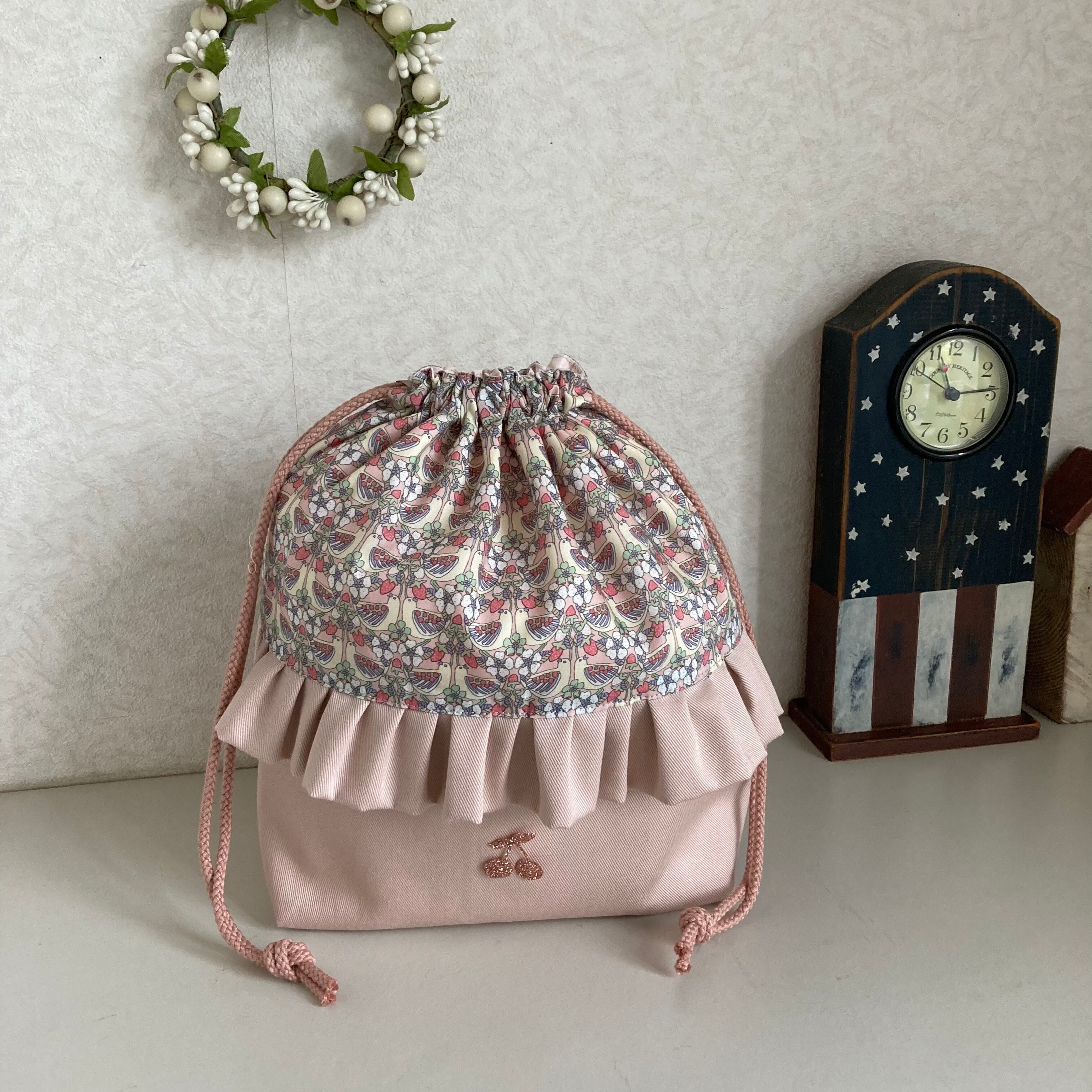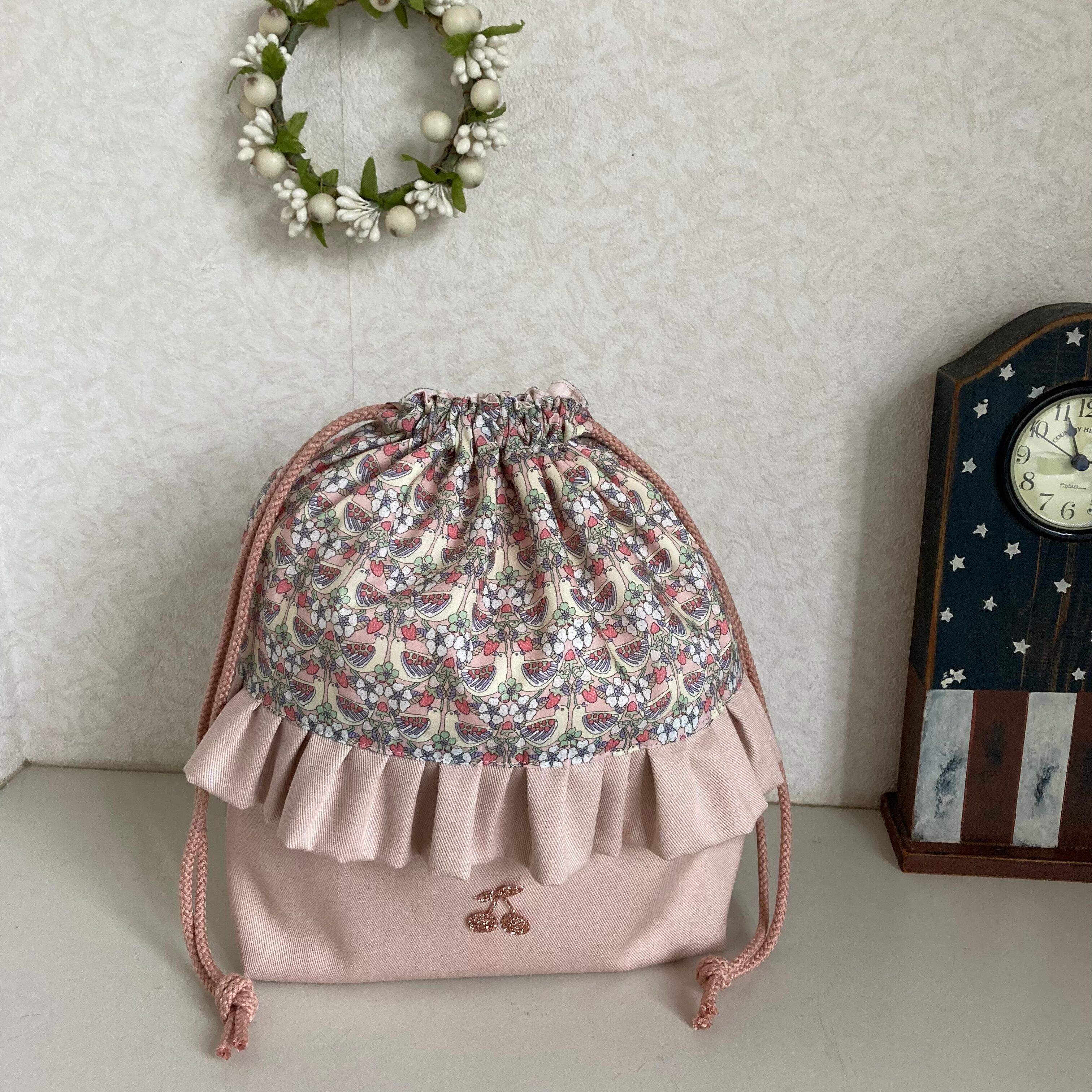 リバティ 巾着袋 (給食袋 お弁当袋) ハンドメイド ストロベリーフィースト チェックアンドストライプ