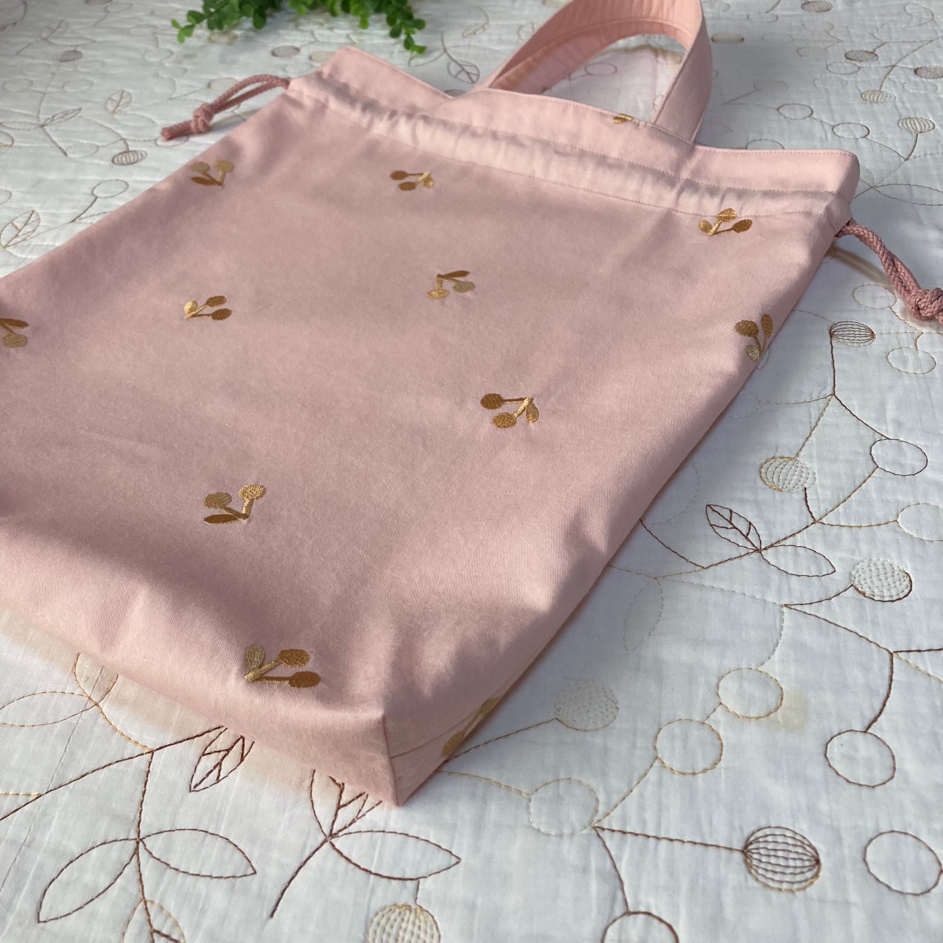 ハンドメイド巾着袋 お着替え袋 体操服入れ 手提げ袋 さくらんぼ 刺繍